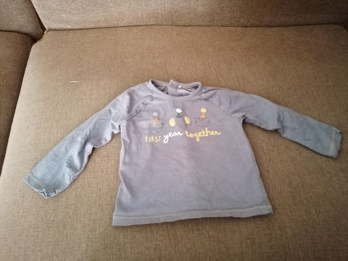 Tee-shirt garçon porté une seule fois. Il faut parti d'un joli ensemble, malheureusement le pantalon n'allait pas car mon fils est en couche lavable (laine).