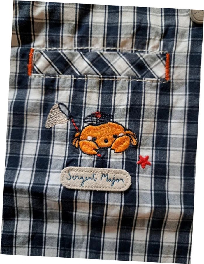 Salopette Sergent Major 6 mois à carreaux avec crabe épuisette et berret marin, phoques sur les pressions. Ouverture entrejambe et double hauteur de bretelles
