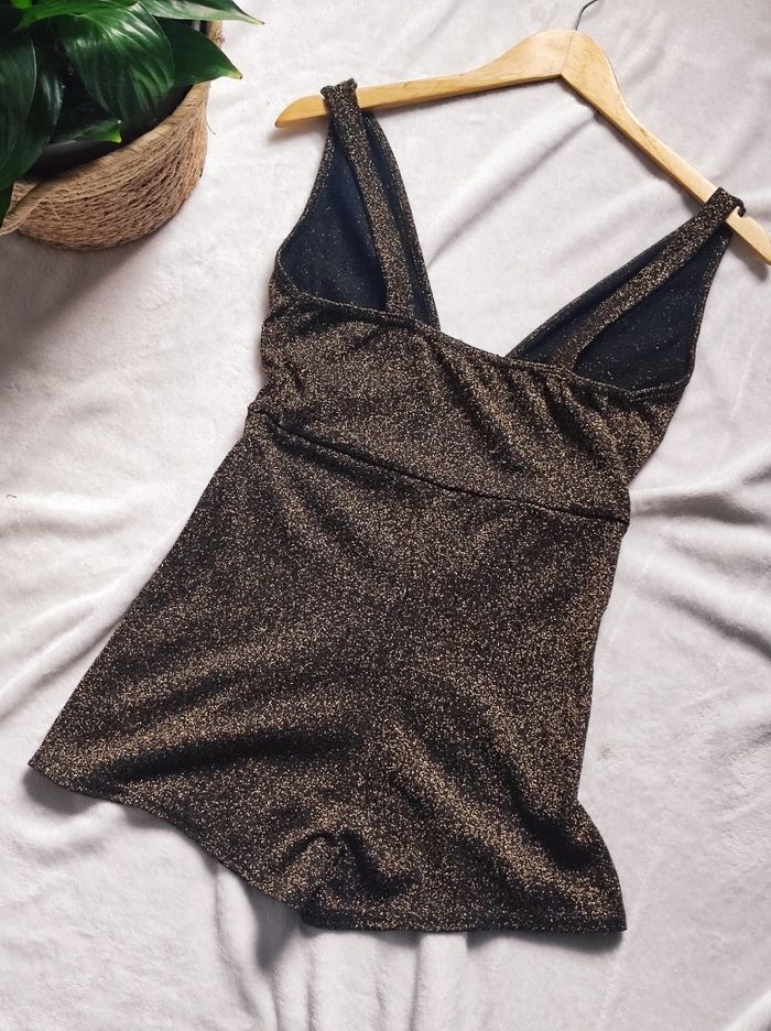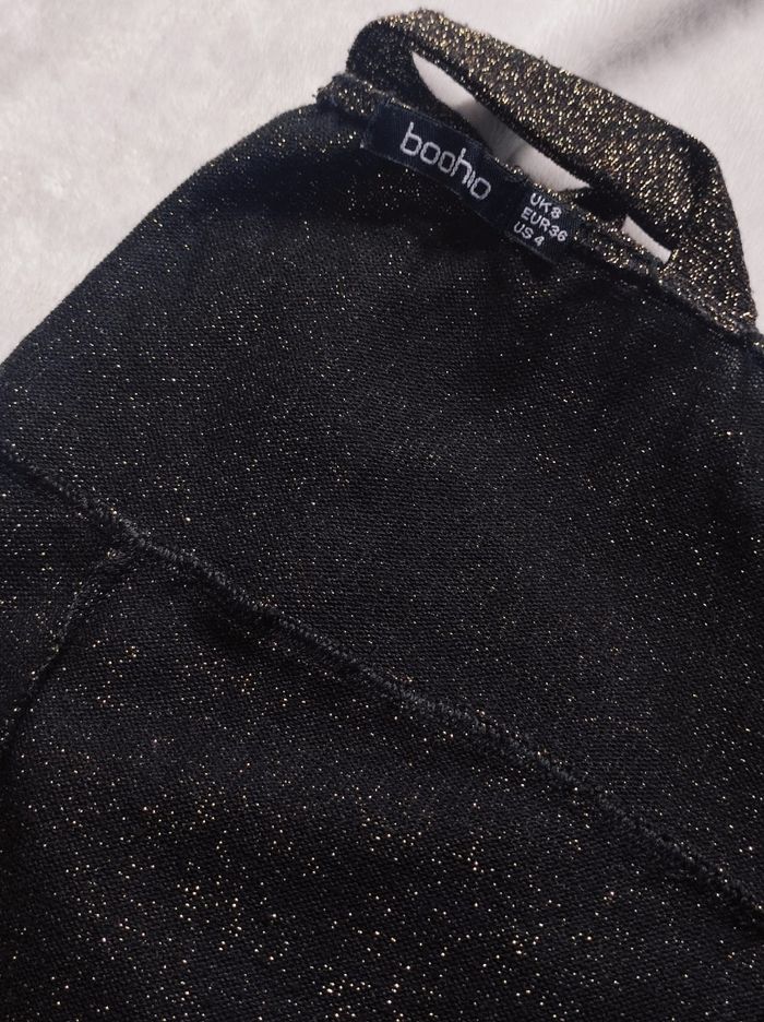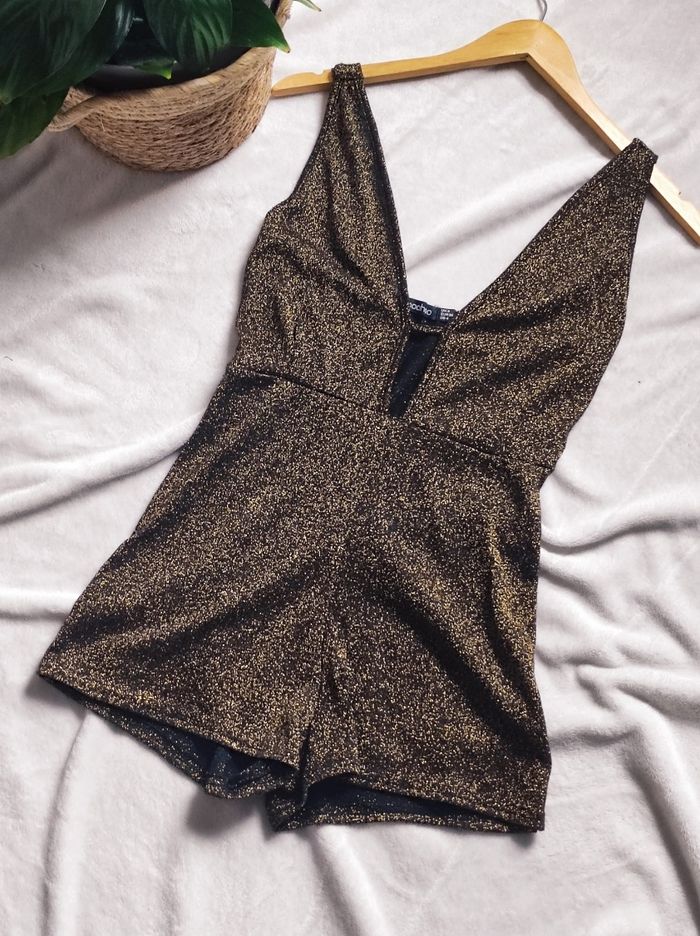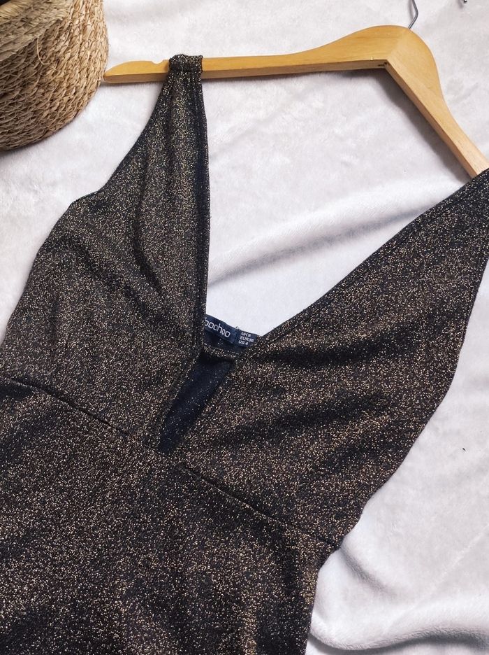 combi-short au fil doré sur fond noir. Décolleté plongeant en grand V. Marque boohoo en taille 36. En parfait état,ni trous tâches ou déchirures