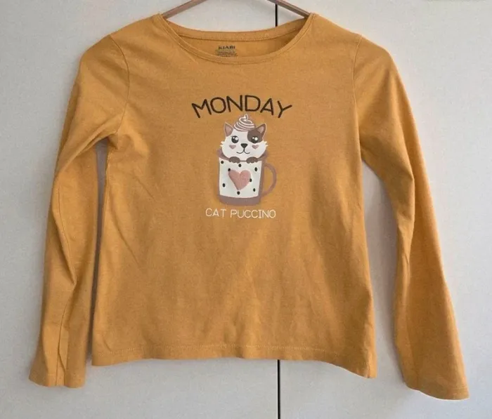 #chapiti10ansfille Trop mignon t-shirt moutarde pour fille, taille 10 ans (KIABI). - Motif kawaii rigolo : un petit chat dans une tasse avec chantilly et cerise 🍒 - Inscription "Monday – Catpuccino", parfait pour affronter les débuts de semaine avec humour - Matière douce et agréable à porter - En très bon état, peu porté Un haut original et plein de bonne humeur pour les petites fans de chats et de looks fun 🐾 📦 Envoi rapide et soigné