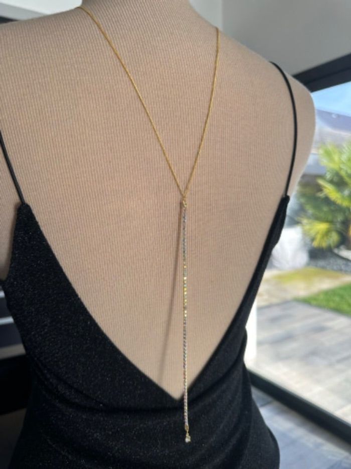 Collier dorsal en or et strass, existe aussi en argenté. Collection Ateliersdisa. Prix d un collier de dos. Materiaux en laiton antiallergique, possibilité de le créer en acier inoxydable argent, or (prévoir 10€ supplémentaires) Possibilité de faire boucles d’oreilles assorti et bracelet N’hésitez pas à me contacter par mail ateliersdisa@gmail.com ou cette messagerie.