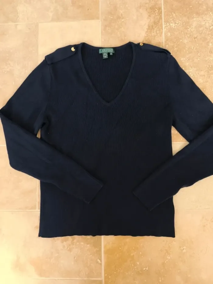 Magnifique pull col V femme XL marine Lauren Ralph Lauren épaulettes excellent état - photo numéro 1