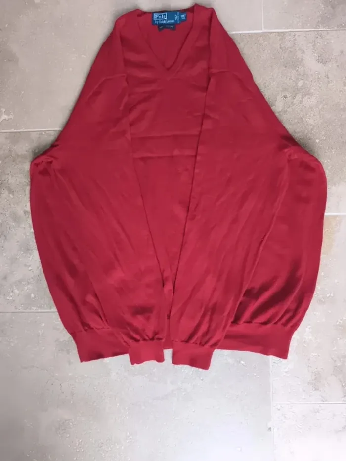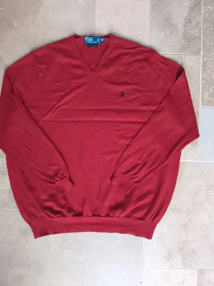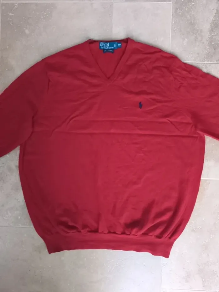 Pull col V rouge logo bleu Ralph Lauren homme 3XLT plusieurs trous, laine mérino - photo numéro 1