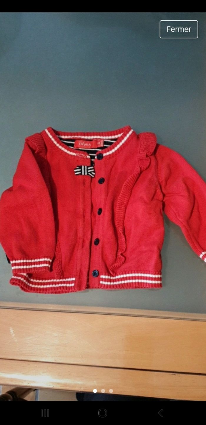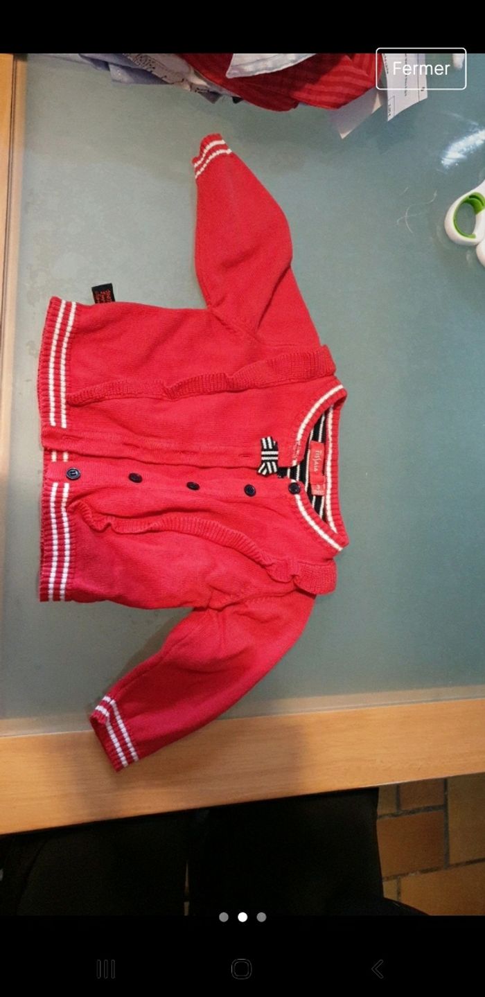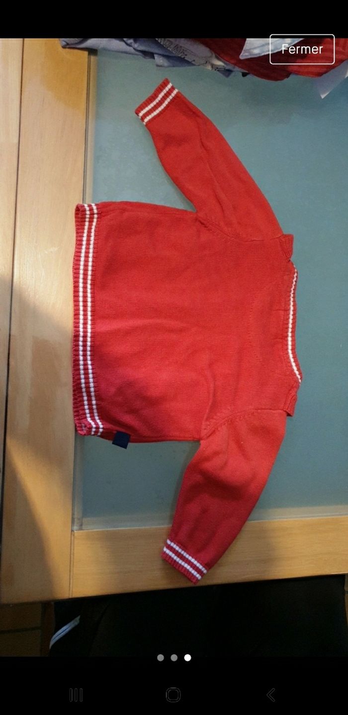 Gilet bébé rouge avec petit nœud bleu et blanc et boutons bleu liserés blanc