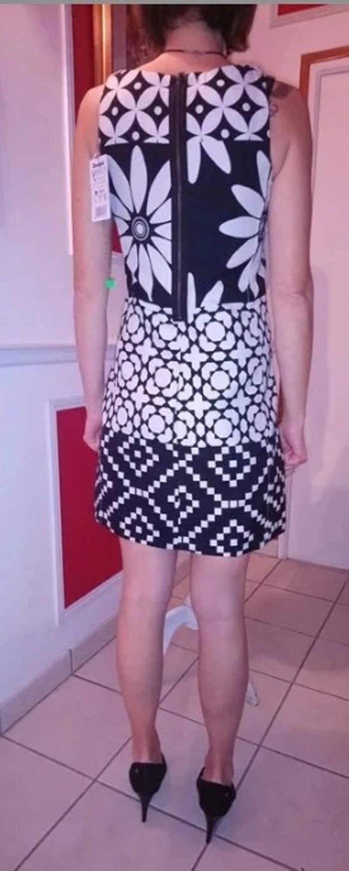 Jamais portée encore étiquetée prix neuve 124 euros Motifs fleuries robe droite noire et blanche Look années 70'S