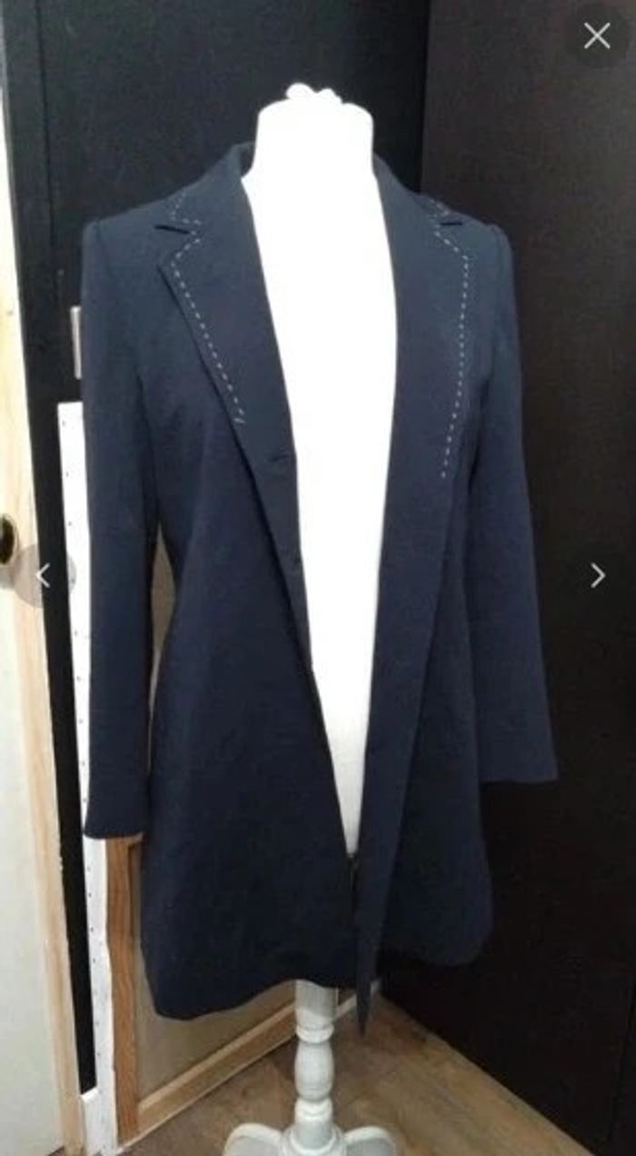 parfait pour travail, soirée, nouvel an, saint valentin, cocktail, mariage, bapteme veste blazer long ou manteau mi saison vraiment chique avec style masculin Veste cintrée Épaulettes Très bon état A porter avec un pantalon de tailleur que je peux proposer en 40. 42 ou seul