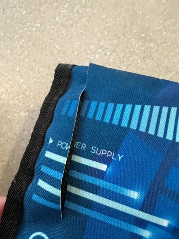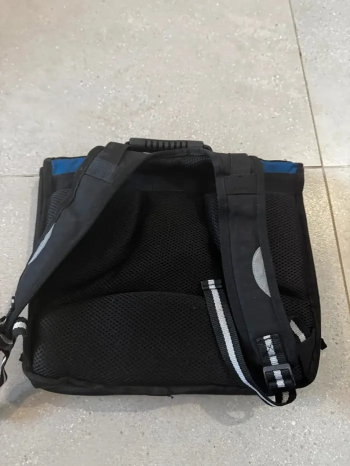 Cartable bleu, il y a une trace de cutter à l'avant, 40x30cm