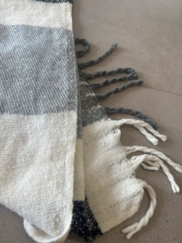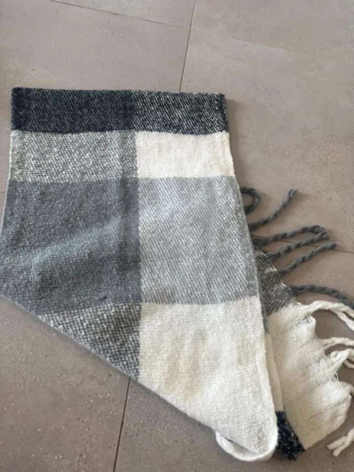 Echarpe grise et blanche, bon état mais il y a une toute petite trace, 50x200cm