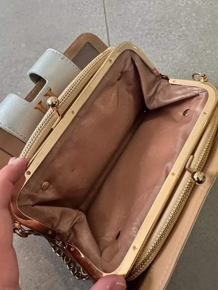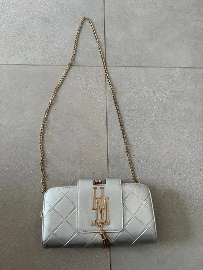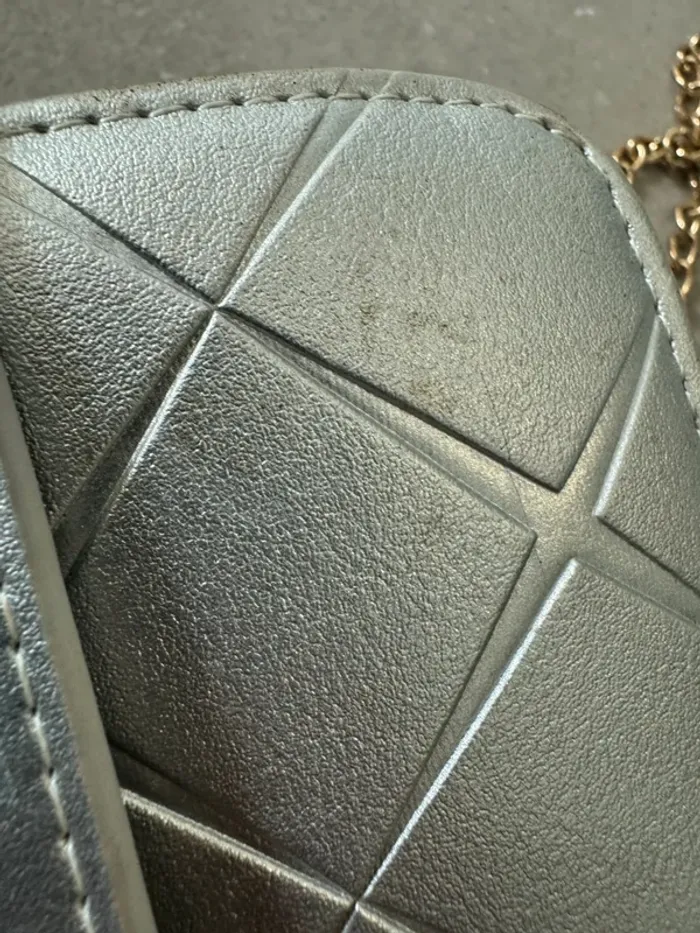 Sac à bandoulière argenté, bon état à l'intérieur, quelques traces à l'extérieur et une trace de cutter, 23*12cm (mv1904)