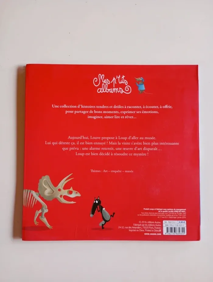 Loup est traîné de force dans un musée, lui qui déteste ça ! Alors qu'il s'ennuie, la sirène d'alarme retentit. Une oeuvre d'art a disparu ! Le voici au coeur d'une véritable enquête policière. Sans plus tarder, Loup endosse son costume de détective et tente de résoudre ce mystère. Finalement, les musées, c'est passionnant ! Éditeur ‏ : ‎ Auzou Broché ‏ : ‎ 31 pages Âge de lecture ‏ : ‎ 4 - 7 ans Dimensions ‏ : ‎ 21.4 x 0.7 x 21.6 cm Livre en très bon état Je vends d'autres livres de la même collection #phil_peg_loup, #phil_peg_mesptitsalbums #loup #mesptitsalbums #musée