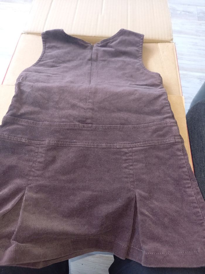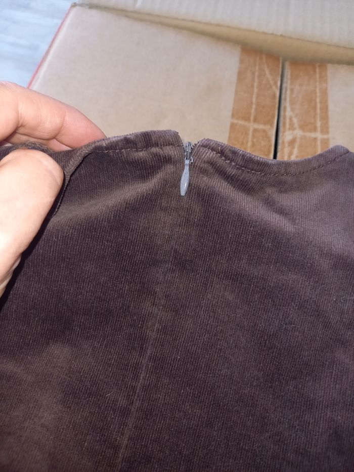 Robe chasuble brune fermée avec une fermeture dans le dos. Motifs boutons. Imitation velours. Lavée avant envoi. Si possible choisir Mondial Relay pour l'envoi.