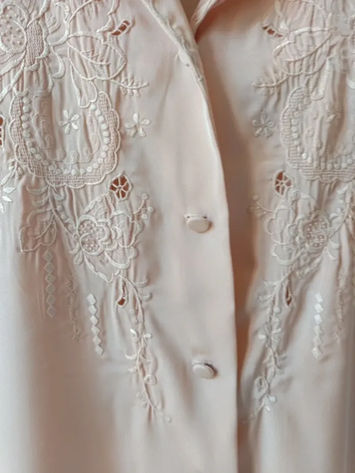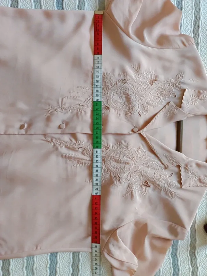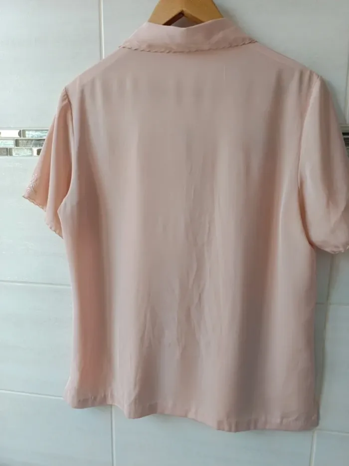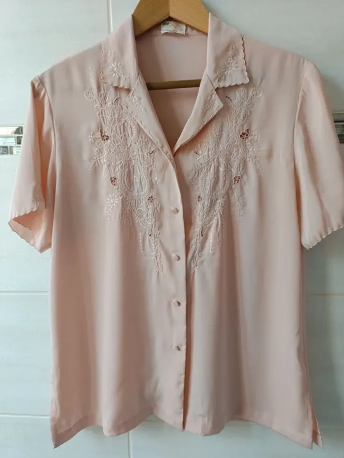 Tous mes articles sont triés par les tailles. Découvrez mon dressing et créez le lot pour économiser sur les frais de port. #vetfem_lisa_38 #vetfem_lisa_40 Chemisier vintage avec magnifique broderie, couleur rose poudré, très beau tissu polyester, touché soie, marqué t.38, convient parfaitement pour t.40 aussi. épaules 42 cm aisselles 52 cm longueur 67 cm