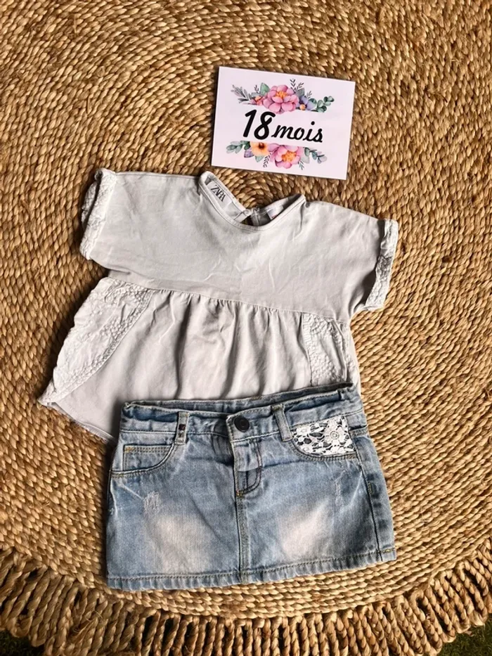 Blouse teeshirt manche courte en coton avec détail broderie anglaise Jupe en jean avec rappel de broderie anglaise sur poche avant et arrière