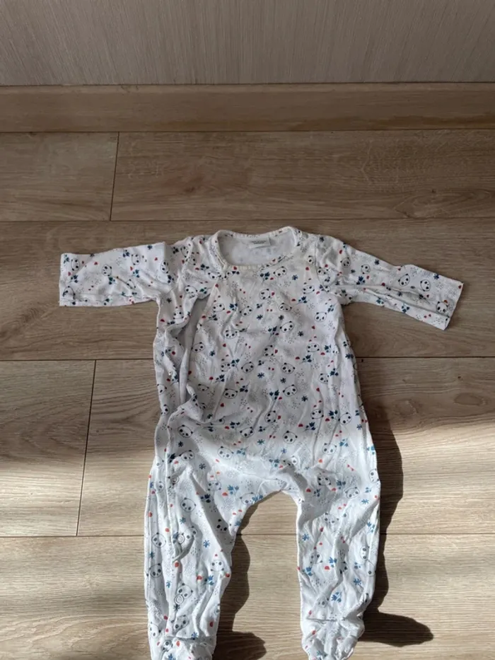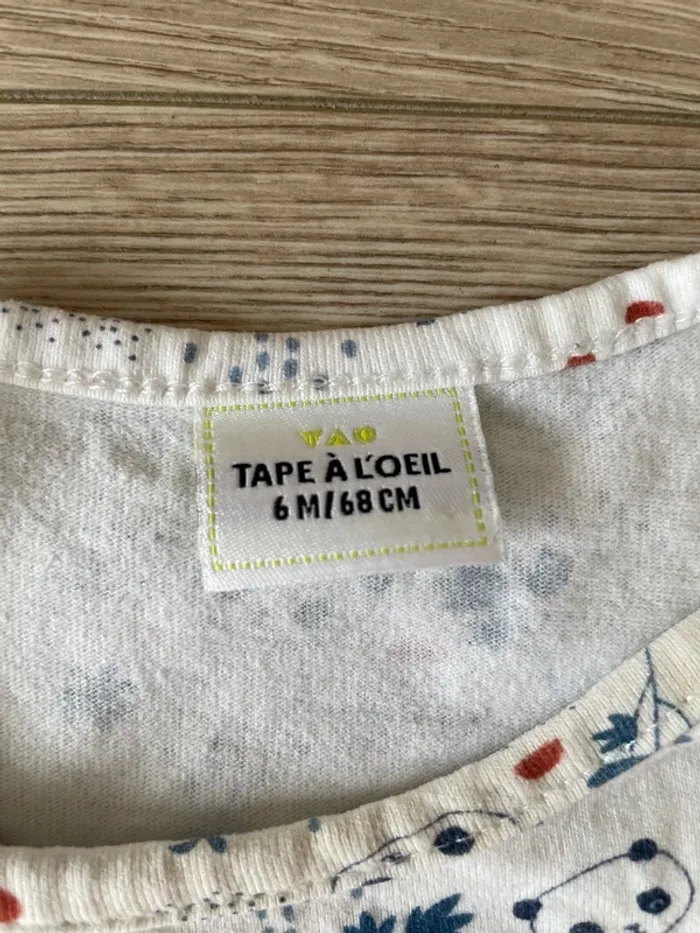 Pyjamas fin Couleur blanc motif bleu et rouge Taille 6 mois Marque tao #pyjamabébétao #pyjamabébé #pyjamasmancheslongues #pyjama1pièce #pyjama6mois #tapealoeilgarcon #pyjamapandabébé