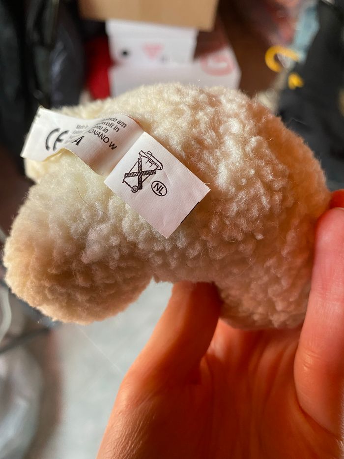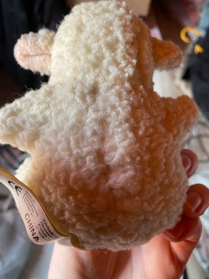 Peluche mouton. Comme neuve. Celle-ci bêler quand on lui appuyer dessus mais les piles ne marchent plus. Je ne sais pas si elles sont remplaçables.