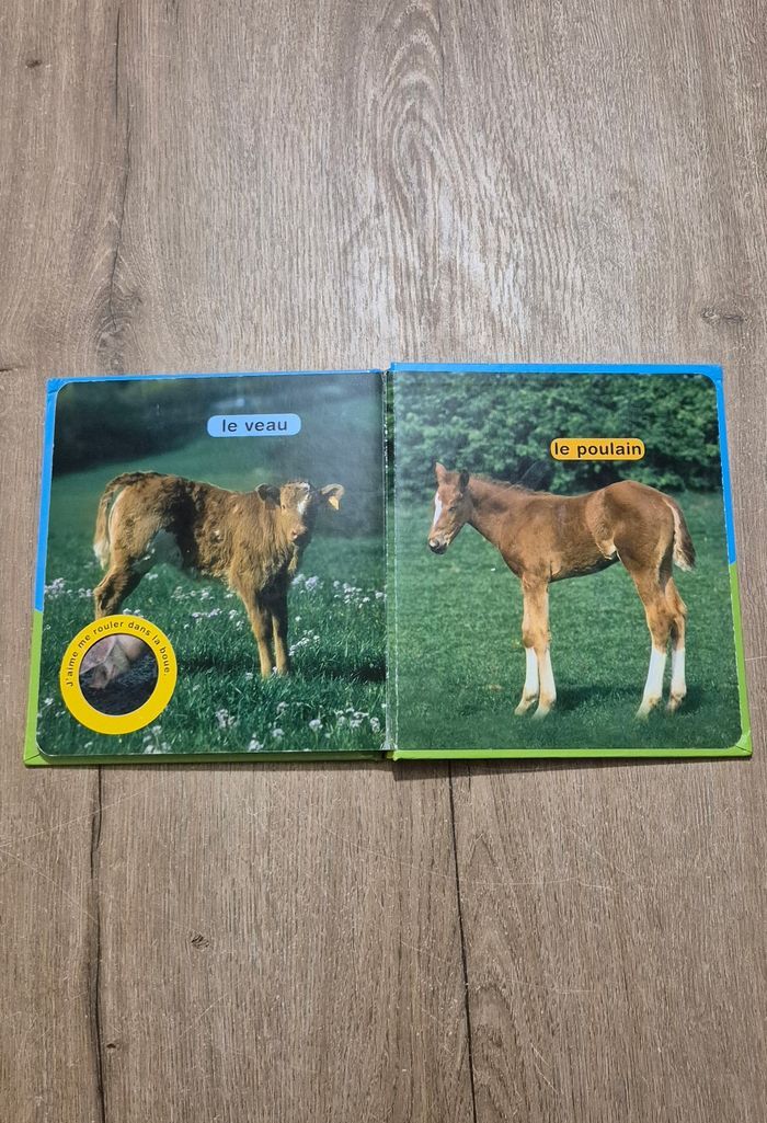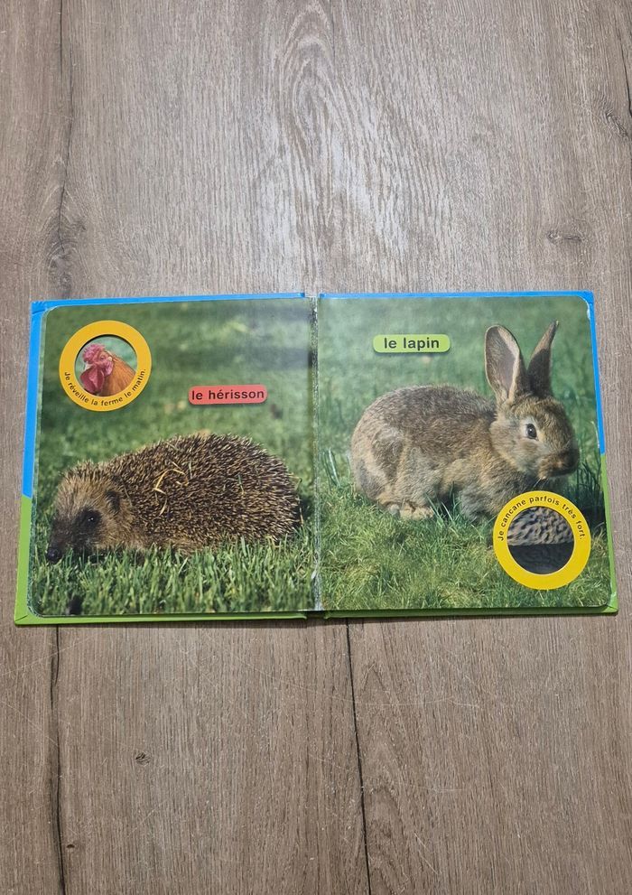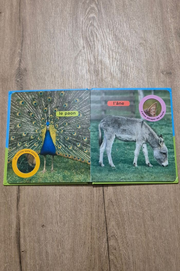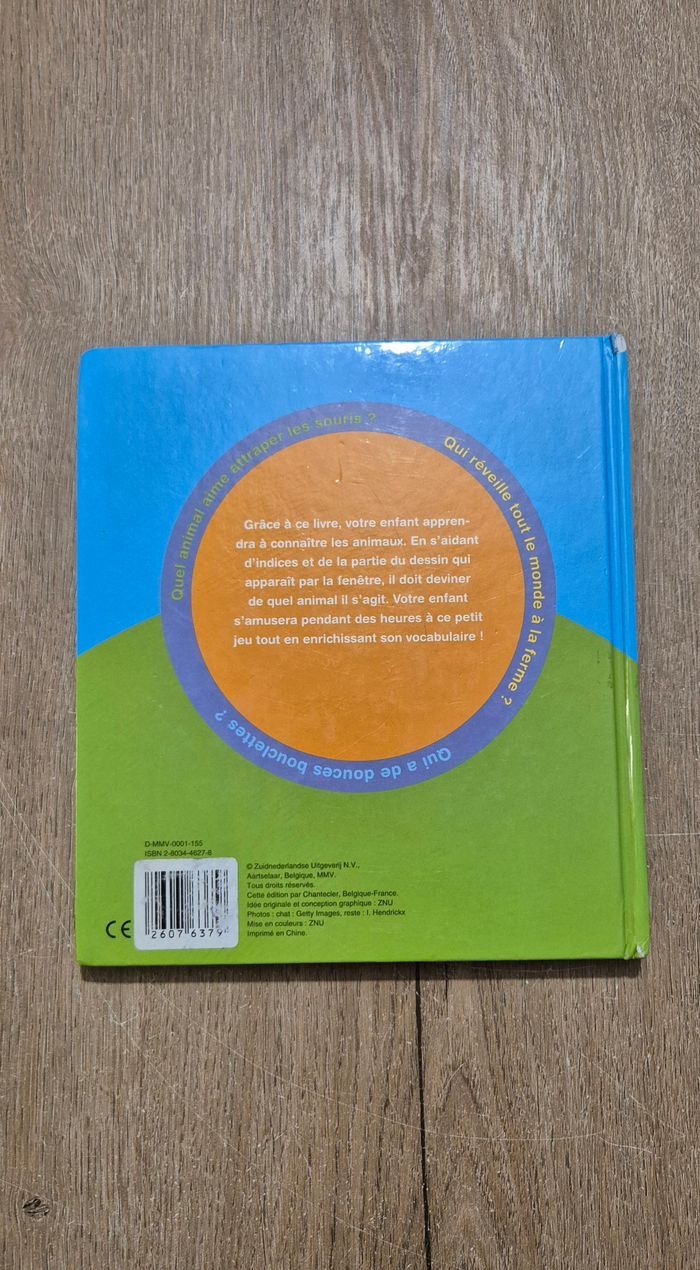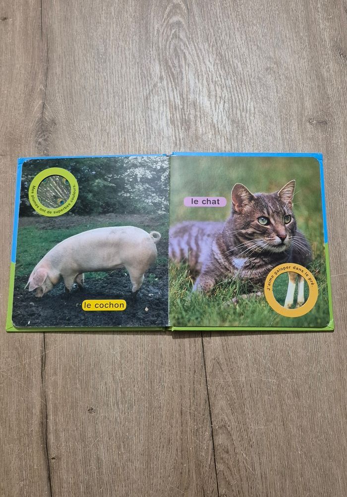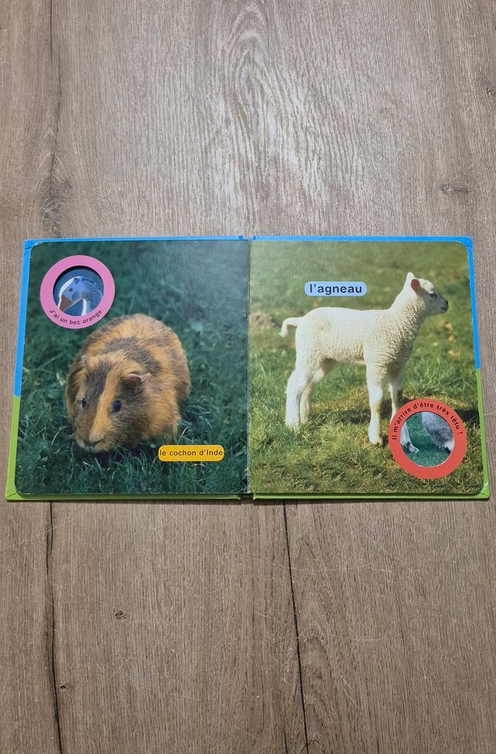 Livre imagier avec de vraies photos : Coucou la poule Grâce aux indices et de la partie de la photo qui apparaît par la fenêtre, l'enfant doit deviner de quel animal il s'agit Éditions Chantecler Très bon état
