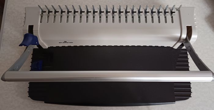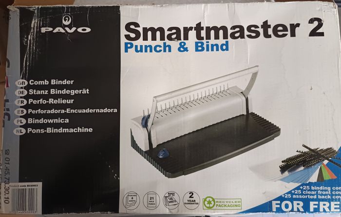 Pavo Smartmaster2 (en bon état général) Perforelieuse jusqu'à 145 feuilles avec Starter Kit complet perfore jusqu'à 8 feuilles A4 et relie 150 feuilles livré avec un Kit de reliure pour 25 dossiers ( assortis ) perforation 21 trous manuel par levier , guide fixe vaste tiroir à confettis amovible modèle convenant au particuliers , étudiants et TPE