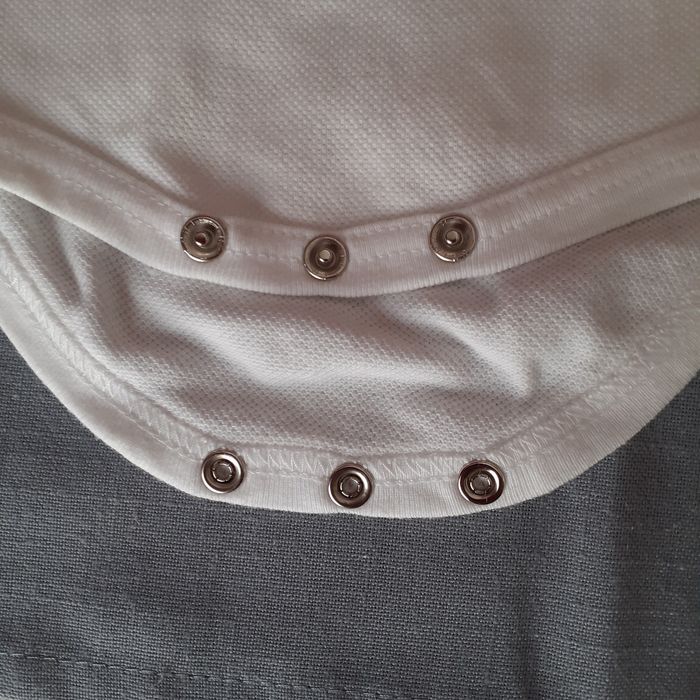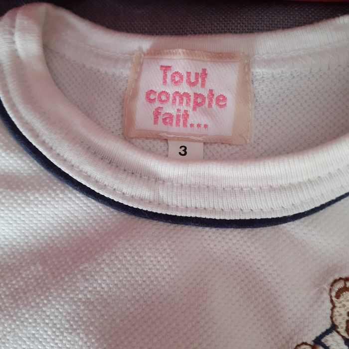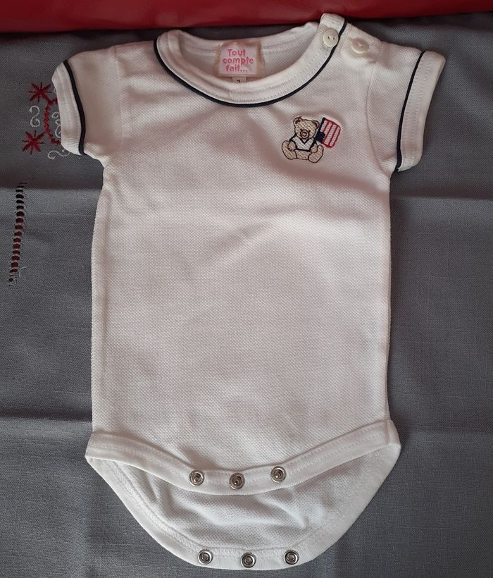 Body marque "Tout compte fait", taille 3 mois. Motif devant; fermeture épaule par 2 boutons; fermeture entre-jambes par boutons-pression métalliques. Coloris blanc cassé. 100% coton // voir photos pour détails