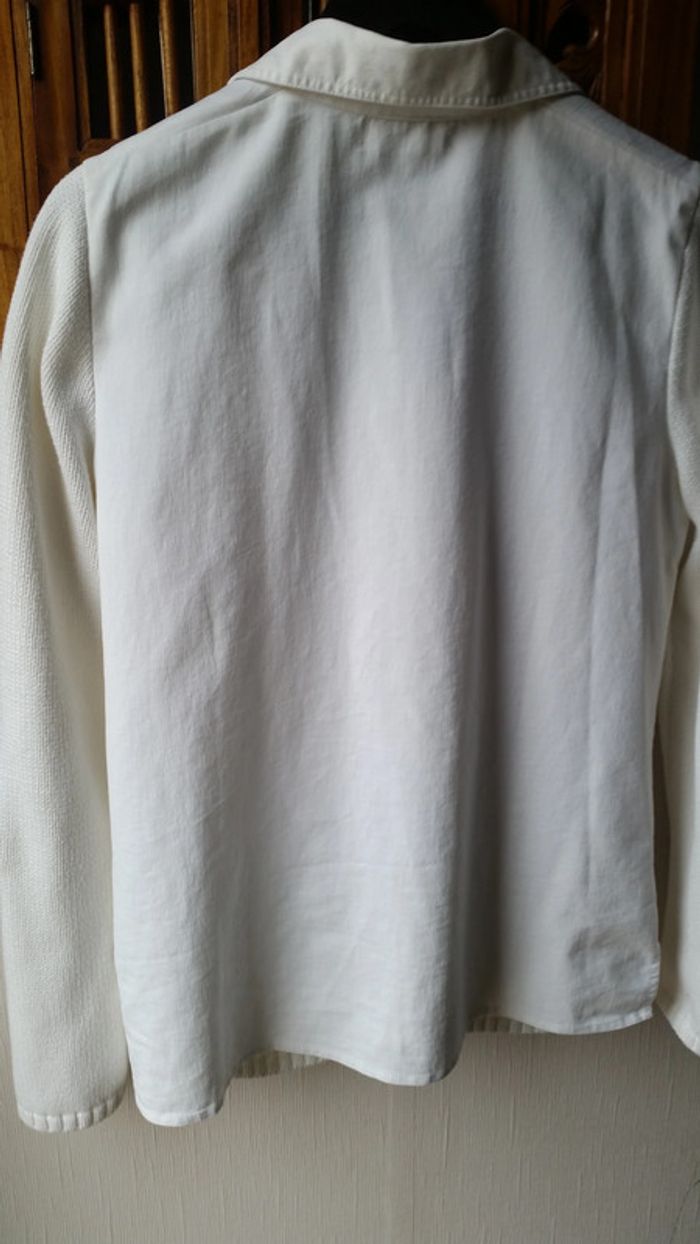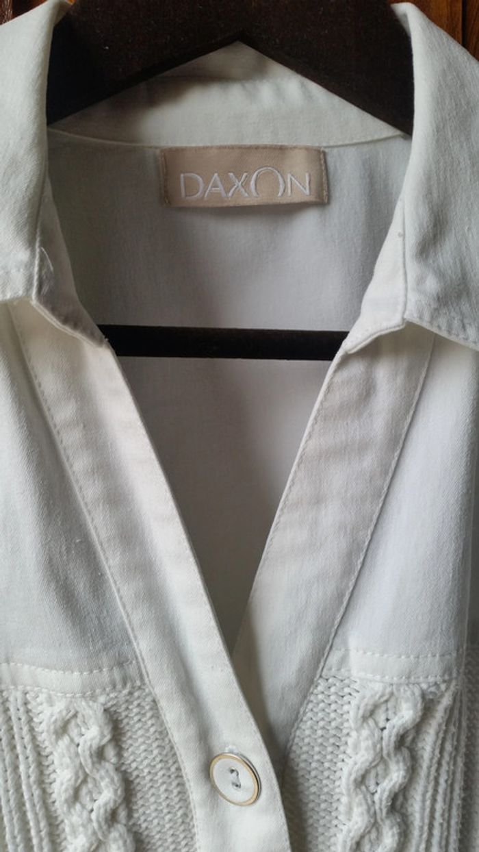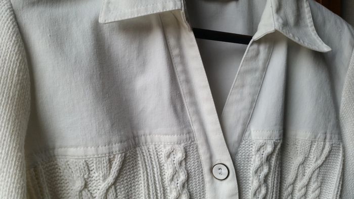 Très jolie veste Daxon, tricot acrylique et tissu coton bien épais . Les manches et une partie du devant en laine acrylique, Col et dos de la veste en tissu coton. Très original, très très agréable à porter, elle est à la fois classe et sport, passe partout ! T38/40