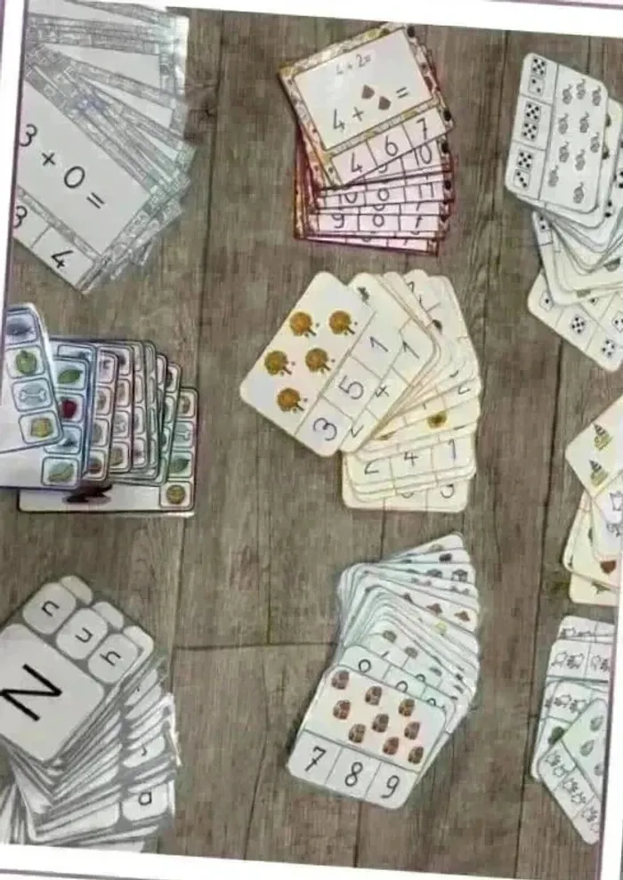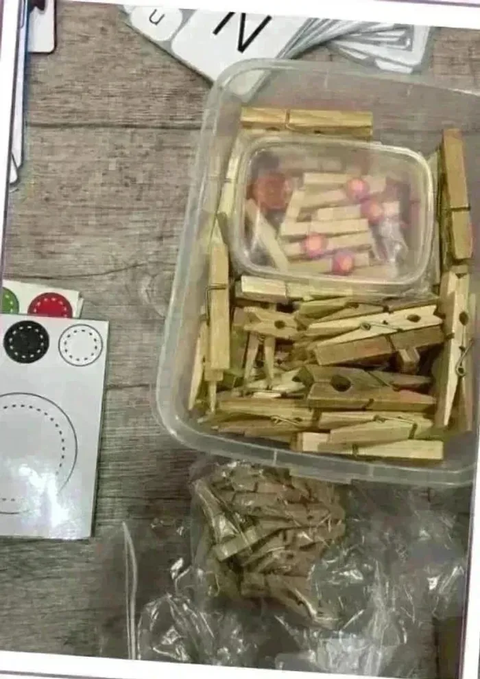 160 cartes à pinces différentes (chacune triée et emballée voir dernière photo) 24 fiches couleurs 20 calculs 11 que mange l’animal 26 majuscule minuscule 16 compte les fruits 32 1 image 1 chiffre 31 1 image 1 dé ou une main + 134 Pinces en bois de différentes tailles #leeloo25jeux