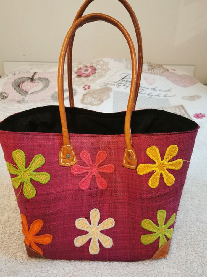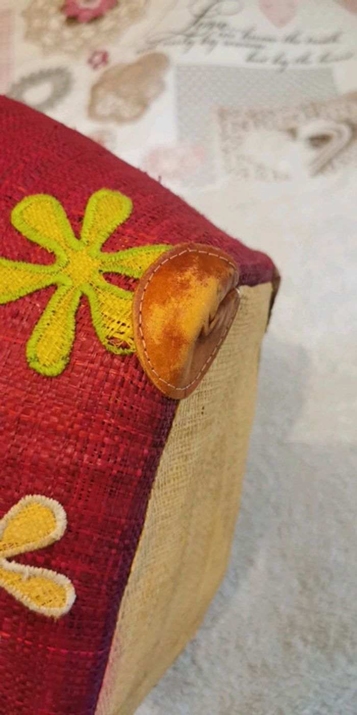 Panier motifs fleurs Bon état général, petites marques d'usure aux coins Se ferme par une lanière Hauteur 24 cm Largeur 40 cm Profondeur 19 cm.