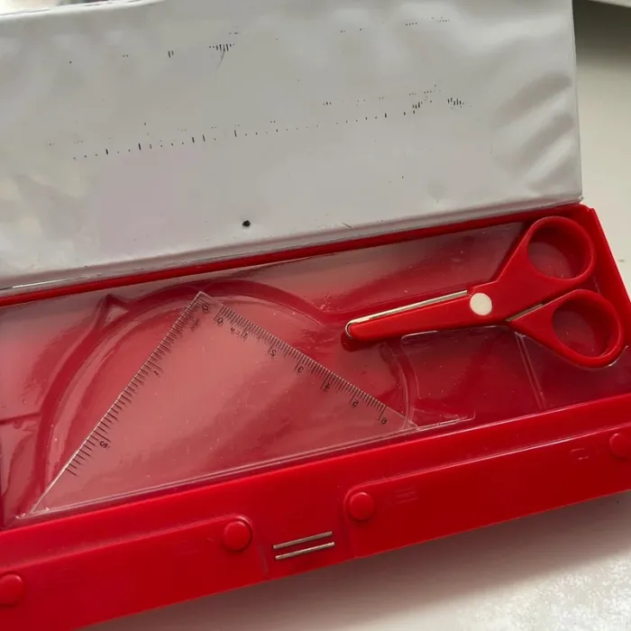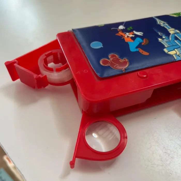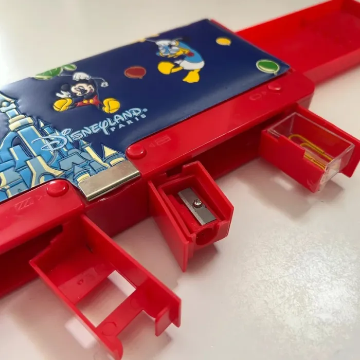 Disneyland Paris Avec différents gadgets : ciseaux, équerre, taille crayon, trombones (x2), ruban adhésif (vide), loupe.