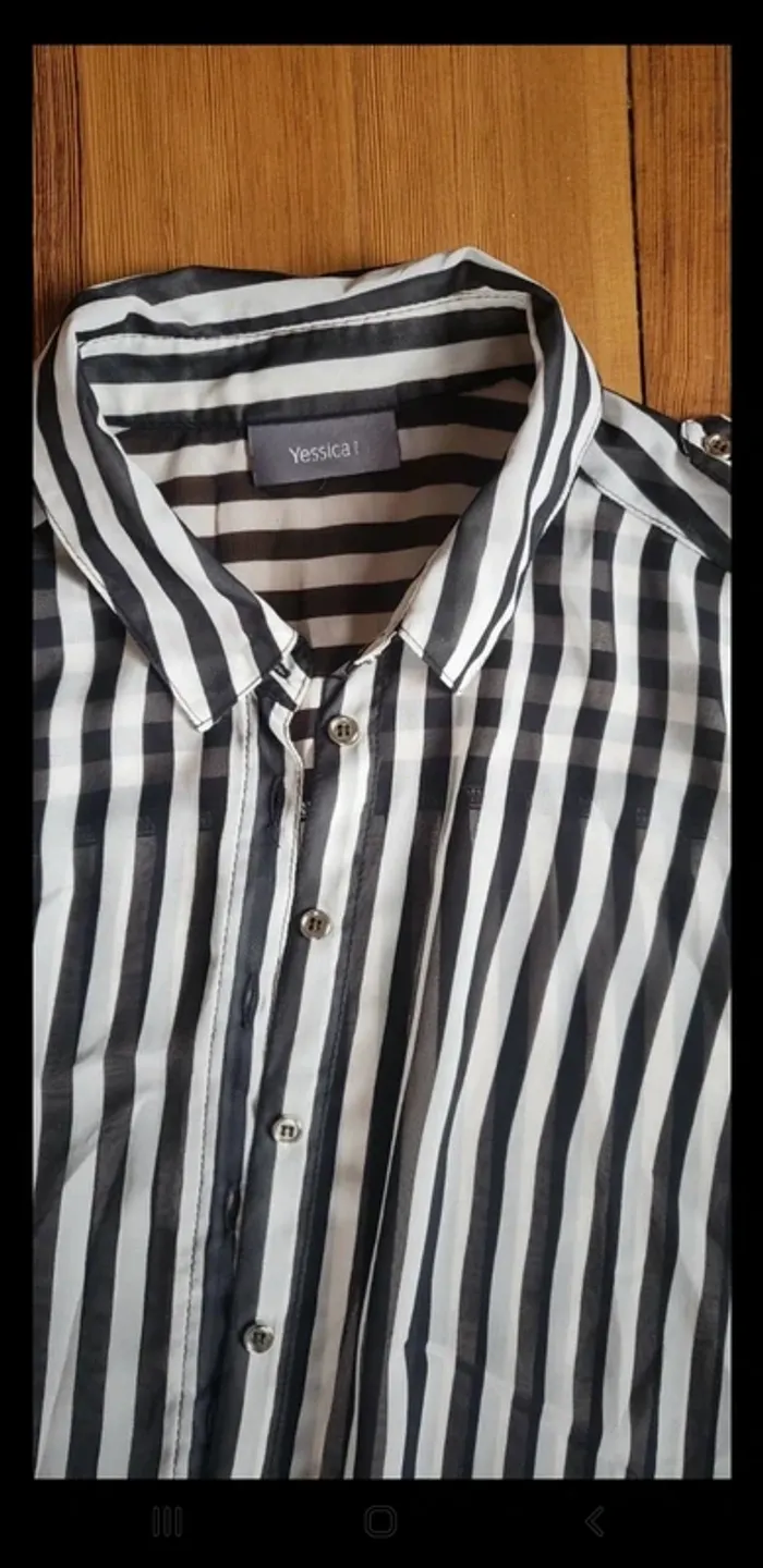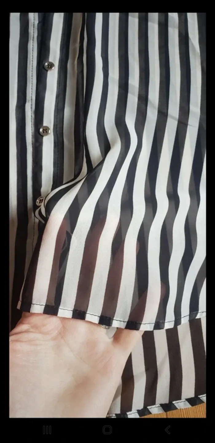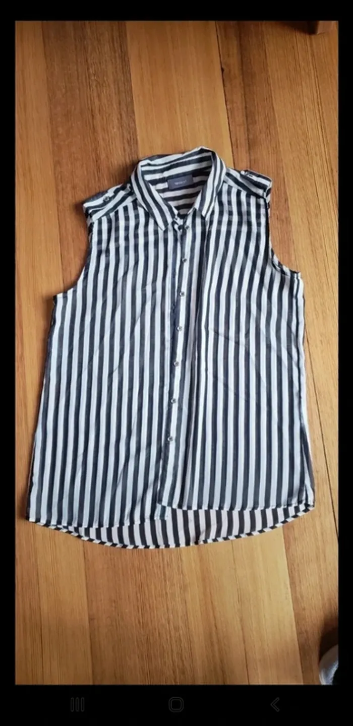 Chemisier à rayures blanc et noir femme taille L. Sans manches et transparent. Petites épaulettes décoratives. Très bon état. Envoi rapide et soigné