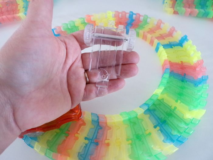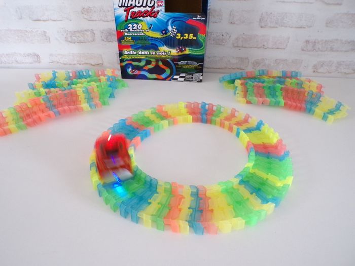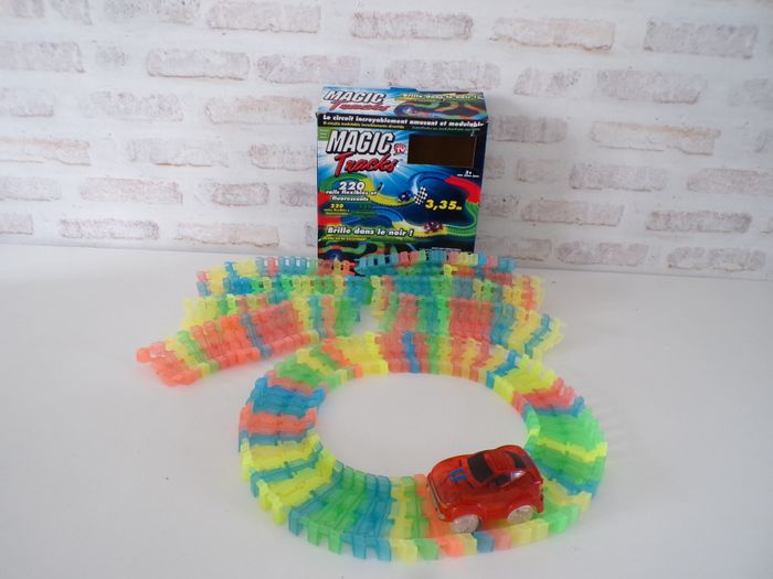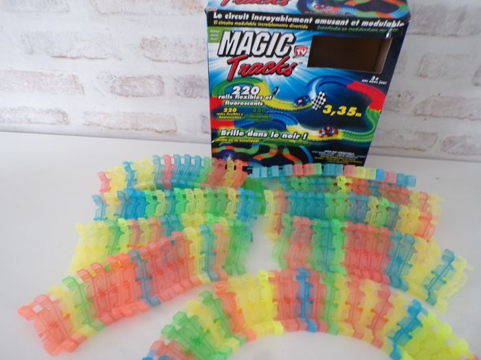 Circuit lumineux Magic Tracks, en très bon état et complet. La voiture fonctionne parfaitement, elle éclaire le circuit dans le noir. La voiture est en bon état, le dessous qui tiens les piles est fragilisé mais fonctionne très bien. Plus de 3 mètres de circuits modulable à l'infini. Plus de notice. La boite est en bon état.