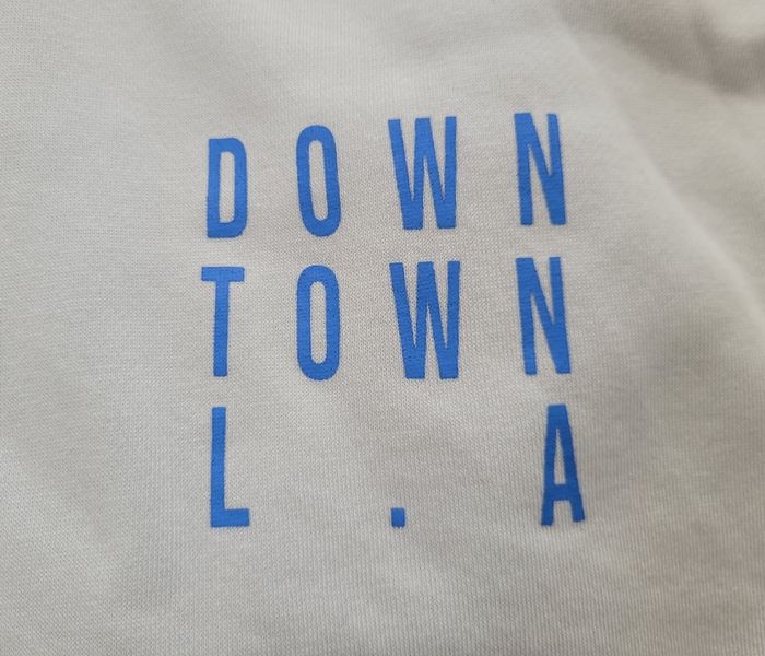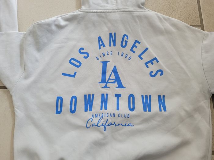 Sweat à capuche de couleur blanc avec inscription sur le cœur et dans le dos de couleur bleu, de la marque Kiabi, taille M, en très bon état. Article lavé pour la vente.