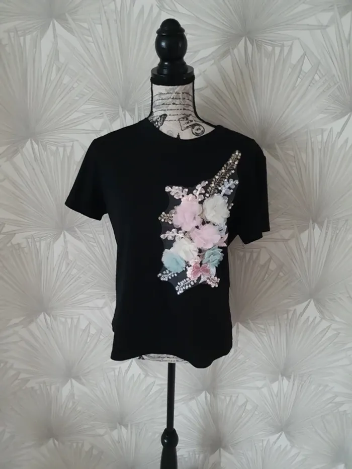 Joli tee-shirt original avec dentelle et perles taille 36/38 - photo numéro 1