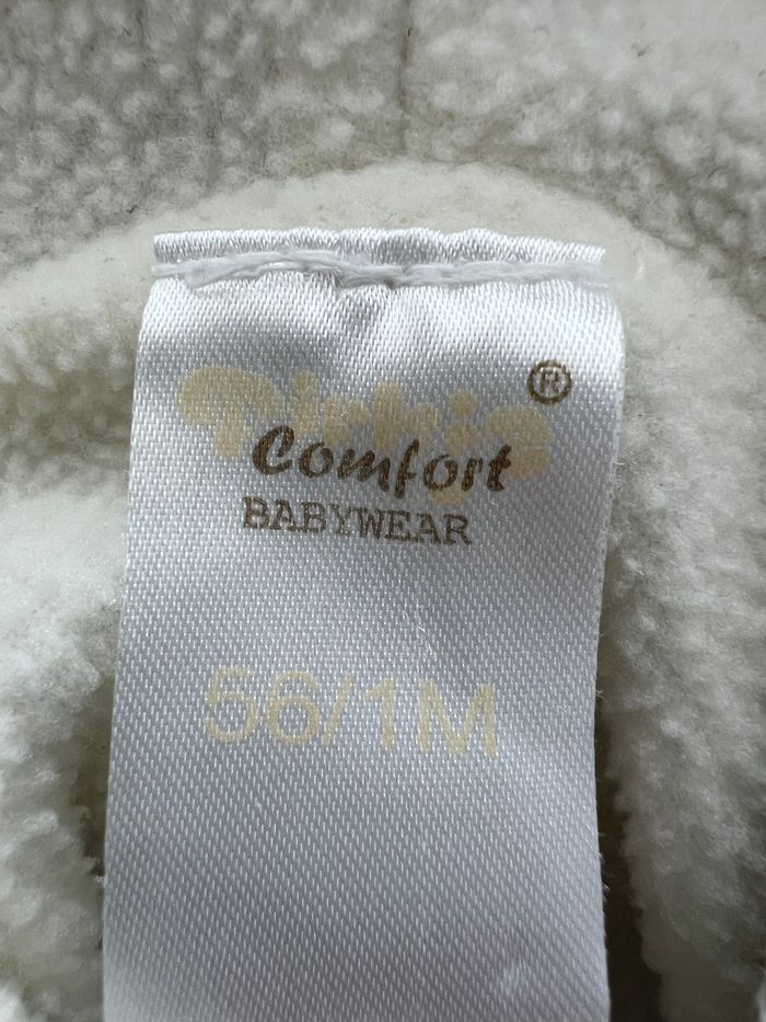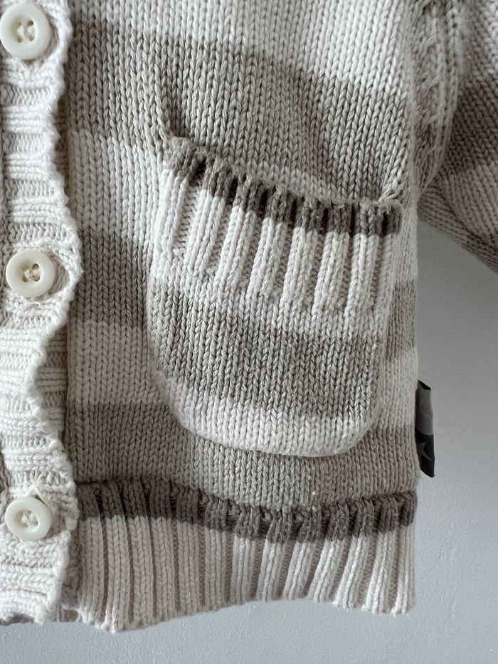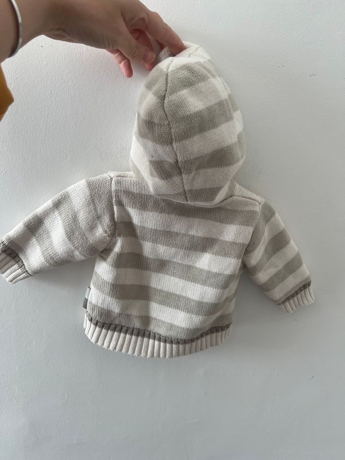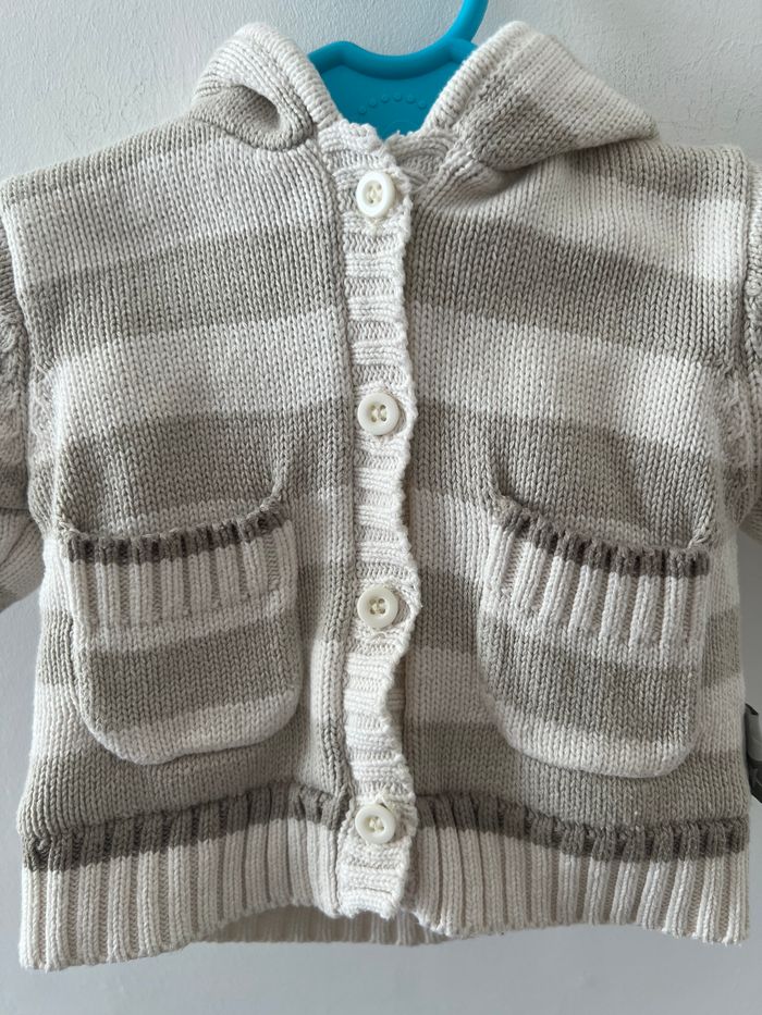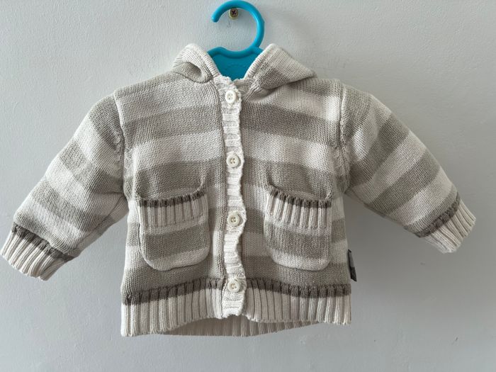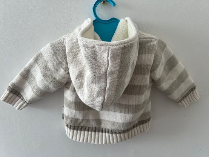 Gilet à capuche en laine, intérieur molletonné hiver bébé garçon Fermeture à boutons Couleur blanc à rayures grise et marron Taille 1 mois Sans marque En très bon état