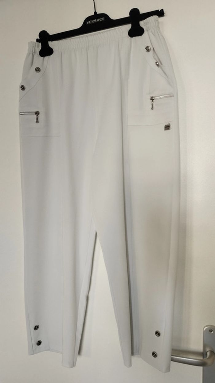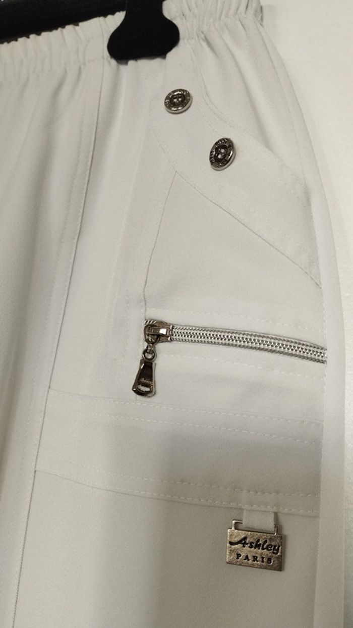 Pantalon court arrive au dessus de la cheville ! Longueur 91cm. Taille 40, taille élastiquée. sans fermeture éclair. 2poches sur le devant et 2 autres petites ouvertures zippées. Largeur bas de pantalon 21cm.