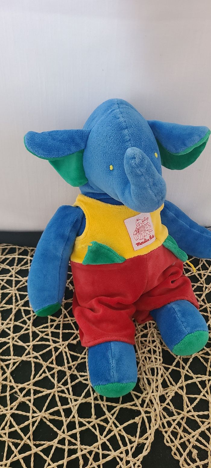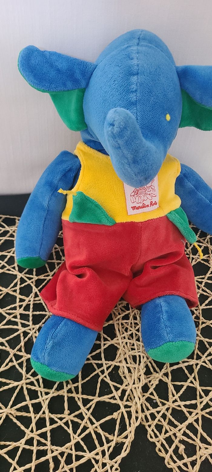 doudou elephant bleu vert salopette jaune rouge peluche moulin roty - - photo numéro 1