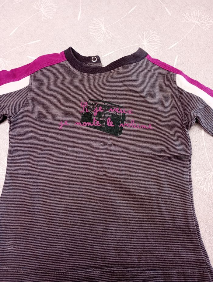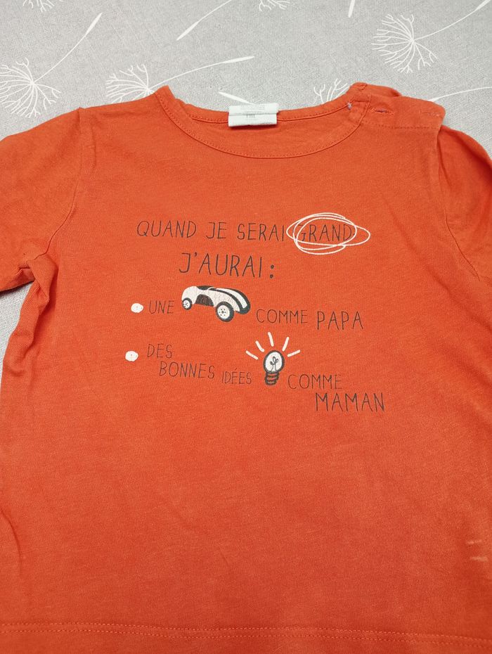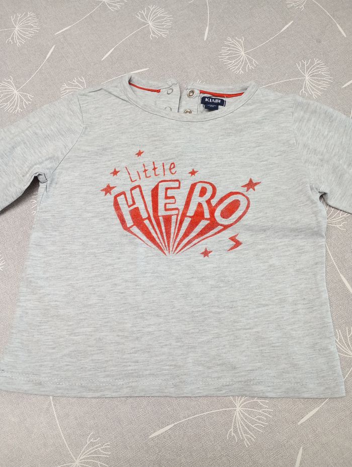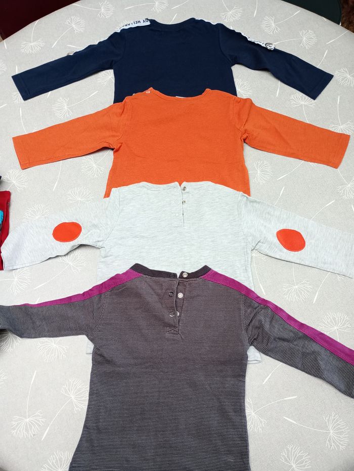 Lot de 4 t-shirts à longues manches en taille 18 mois. Ligné gris, marque Tissaia. Little Hero, marque Kiabi. Orange, marque Kiabi. Bleu marine, marque Hello Boy. Très bon état. Bac 29