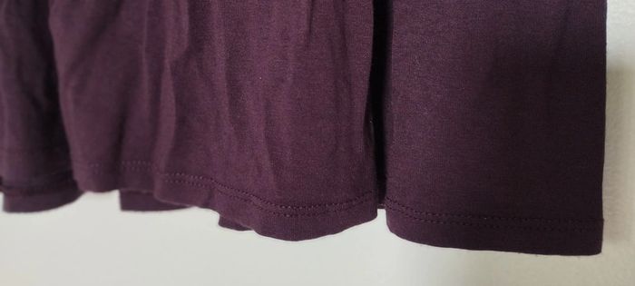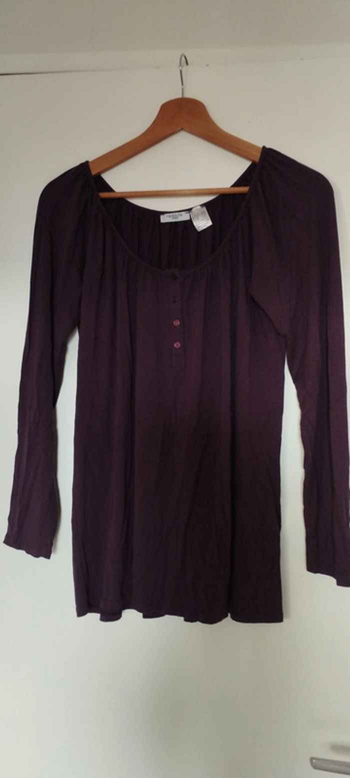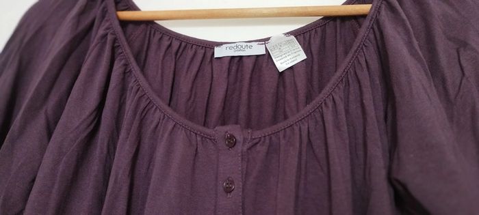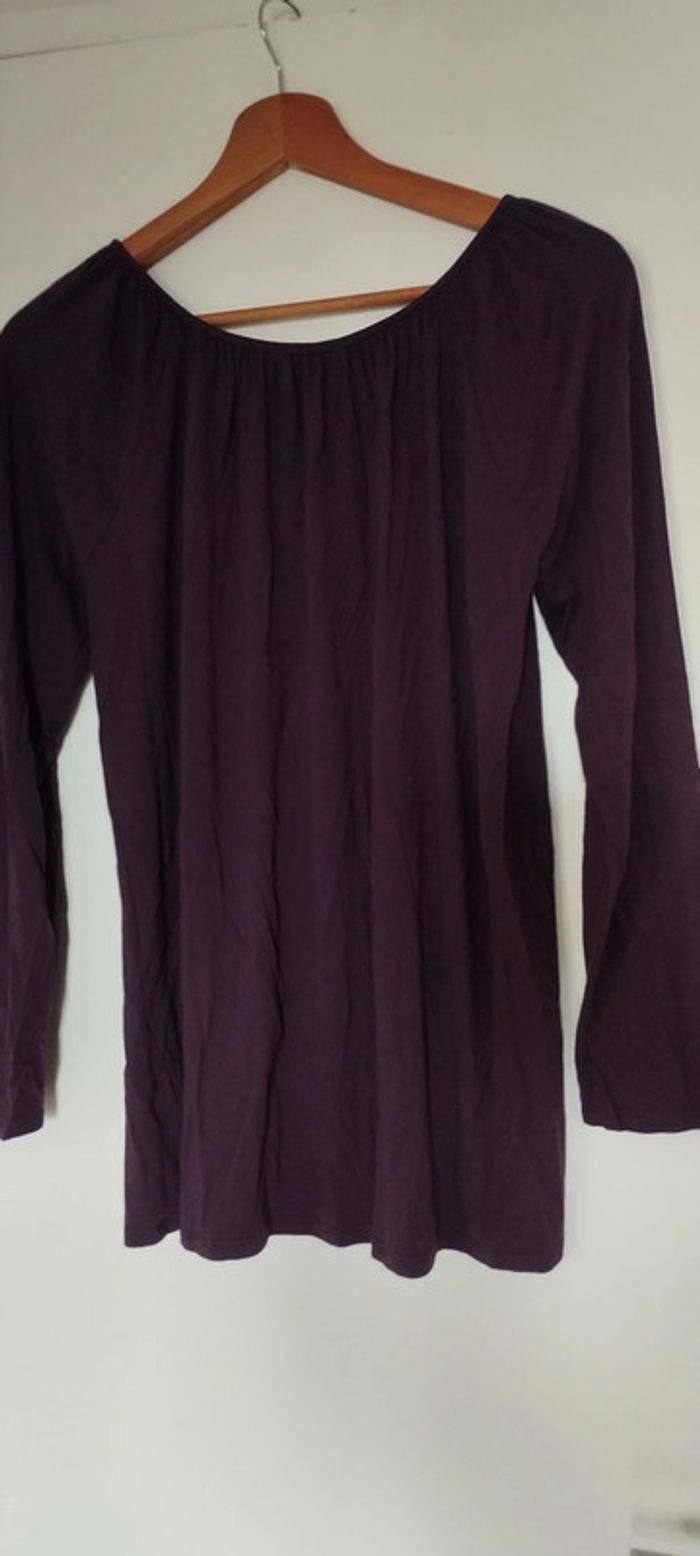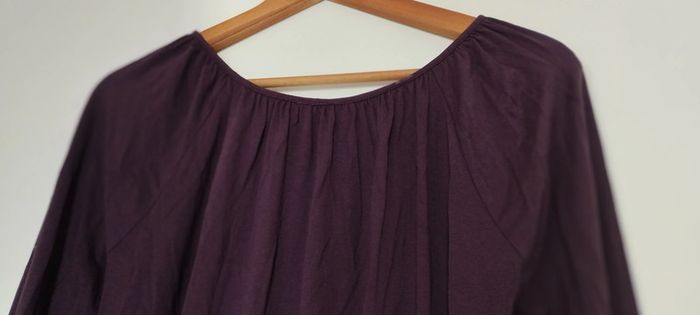 T-Shirt long. Col rond froncé tout au tour du col. Longues manche. coloris prune. Taille 38/40. Longueur 64cm.