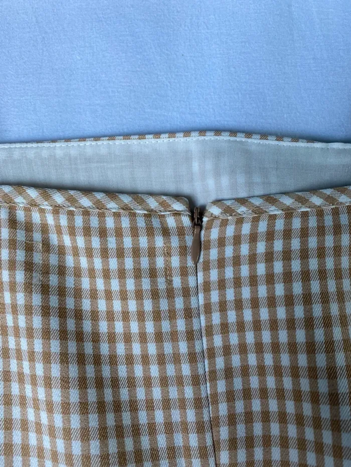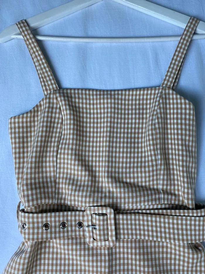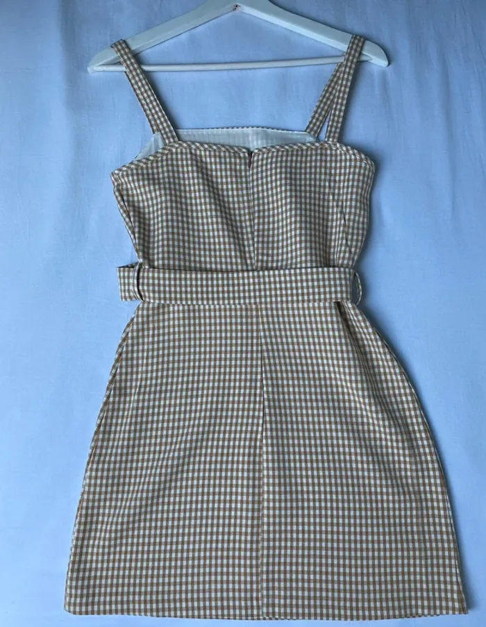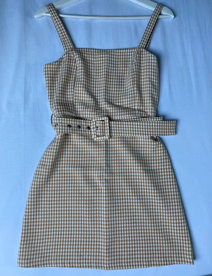 Mini robe avec imprimer vichy beige et blanc, avec ceinture pour marquer la taille (possibilité de l’enlever ou d’en mettre une autre), portée une seule fois, de bonne qualité, cintré et courte, parfait pour l’été :)