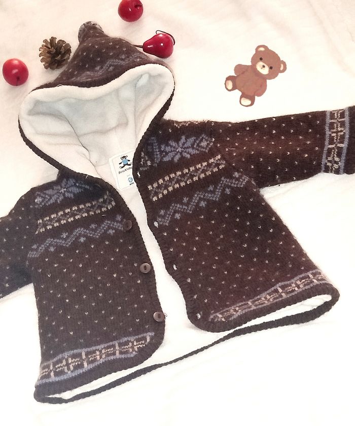 🍼 Taille 6 mois 67 cm... Très peu porté.. T.bon état. Cardigan à capuche, contient 80% de laine. Il est doublé d'une petite polaire