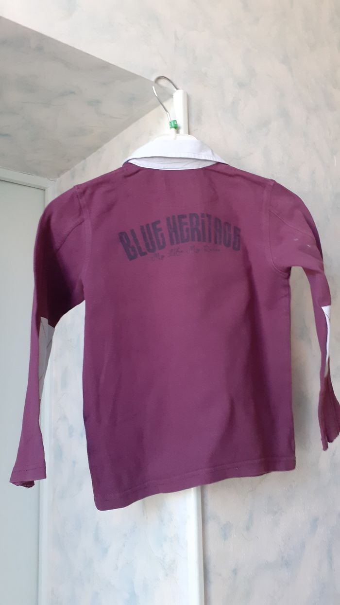 Vends un polo manches longues, 100 % coton, couleur bordeaux avec col chemise rayé, marque YCC Collection, taille 6 ans.