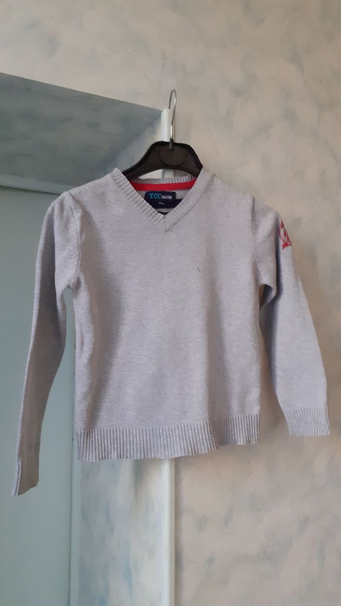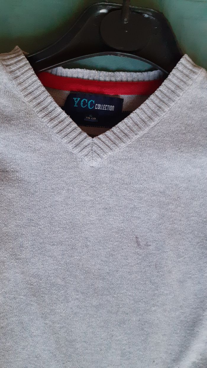 Vends un pull en maille coton, couleur gris uni devant et avec rayures rouge et bleu marine dans le dos, marque YCC Collection, taille 6 ans. A noter : une petite tache devant qui n'est pas partie au lavage (voir photo 2).