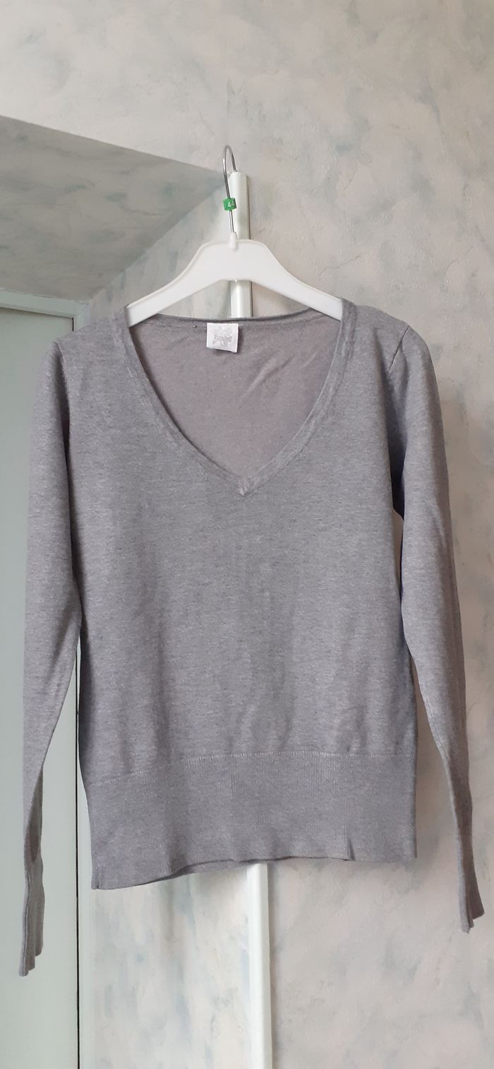 Vends un pull fin en coton et viscose, col V, couleur gris clair, marque Camaïeu, taille 36. Longueur dans le dos : 53 cm Largeur aisselle à aisselle : 41 cm.