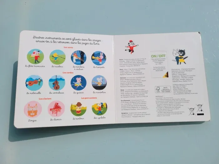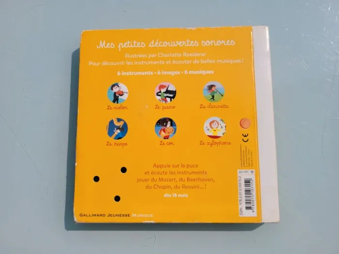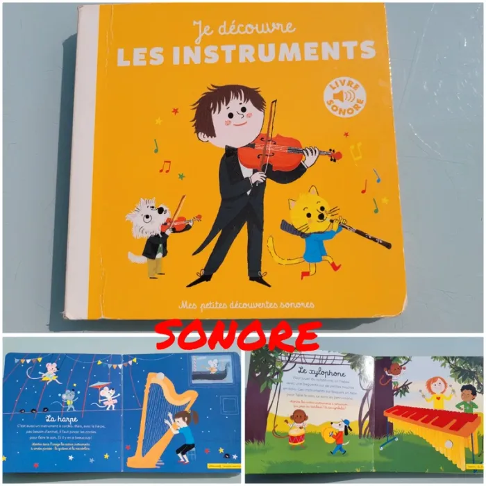 MES PETITES DÉCOUVERTES SONORES GALLIMARD JEUNESSE MUSIQUE JE DÉCOUVRE LES INSTRUMENTS 6 images - 6 imusiques - 6 instruments- Violon- Piano- Clarinette- Harpe - Cor- XylophoneAppuie sur la puce et écoute les instruments jouer du Mozart, du Beethoven, du Chopin, du Rossini... En très bon état (quelques légères traces d'usures sur la couverture), toutes les puces fonctionnent, les piles sont neuves Mes autres livres sonores : #livresonoremooglou Mes autres livres enfants : #livreenfantmooglou