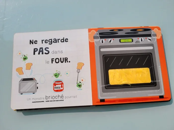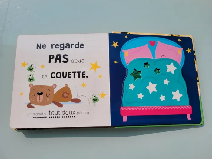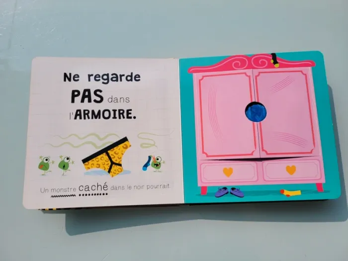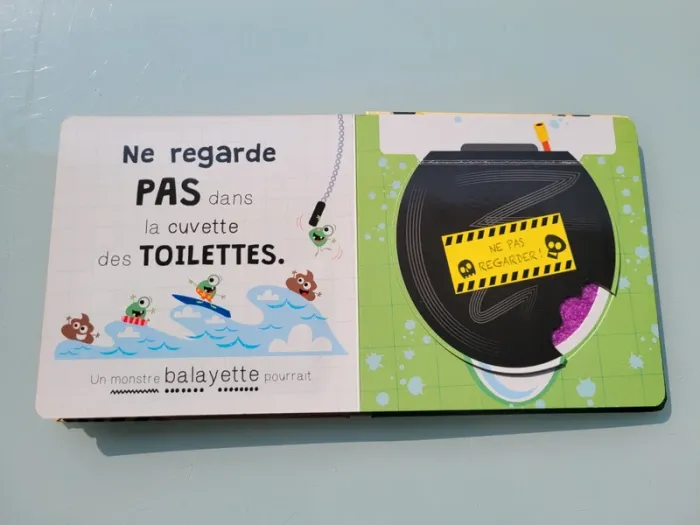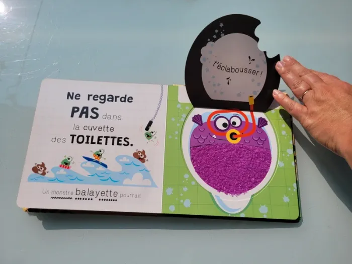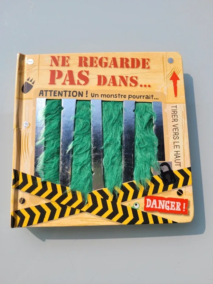 NE REGARDE PAS DANS ... ATTENTION UN MONSTRE POURRAIT... « Ne regarde pas dans l'armoire, car tu pourrais y trouver un monstre caché dans le noir ! » Oseras-tu regarder dans le frigo, dans la cuvette des toilettes ou sous ta couette ? Ce livre hilarant est rempli de monstres cachés sous des rabats à soulever. Les rabats avec des découpes et les surfaces en fourrure favorisent la coordination main/oeil. Les surfaces à toucher très poilues sont irrésistibles pour les jeunes enfants. Éclats de rire garantis ! Très bon état Mes autres livres à toucher : #livreatouchermooglou Mes autres livres enfants : #livreenfantmooglou