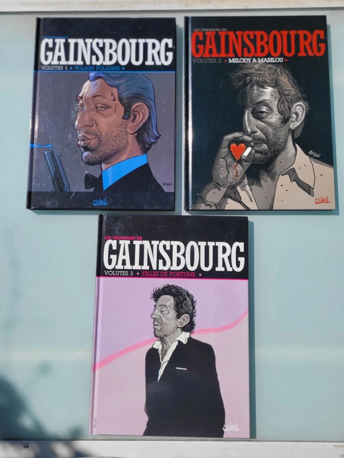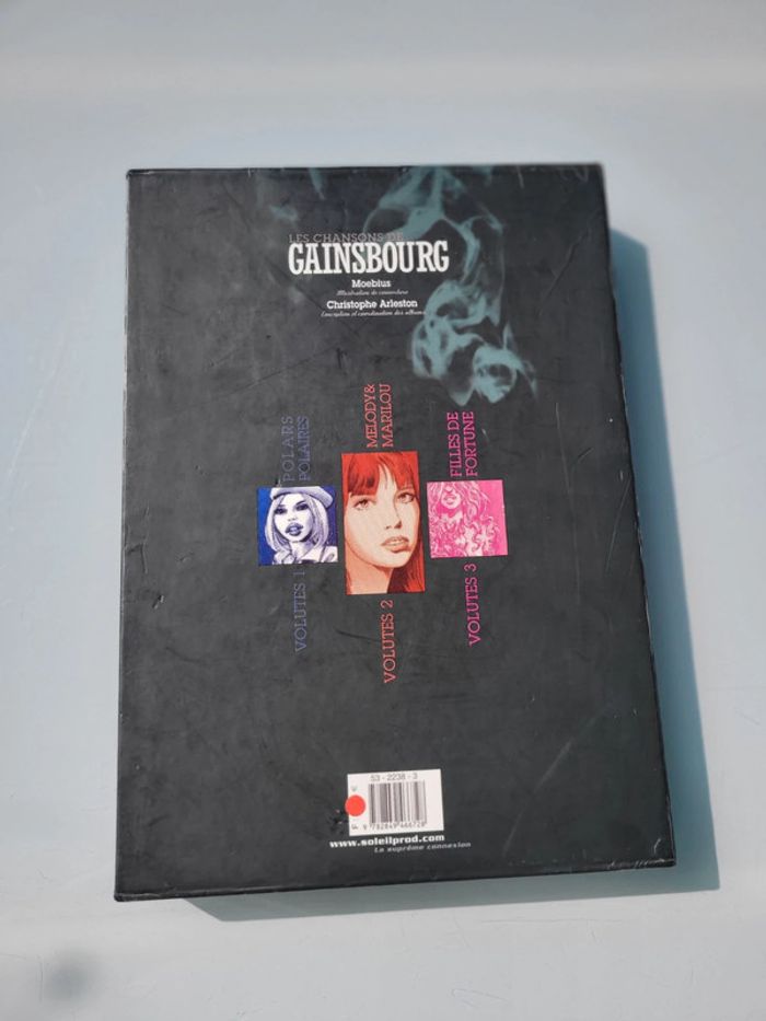 LES CHANSONS DE GAINSBOURG COFFRET DE 3 VOLUTES ÉDITIONS SOLEIL - Volute 1 : Polars Polaires - Volute 2 : Melody & Marilou - Volute 3 : Filles de Fortune Les intérieur sont en excellent état, le coffret et les couvertures montrent quelques traces d'usure