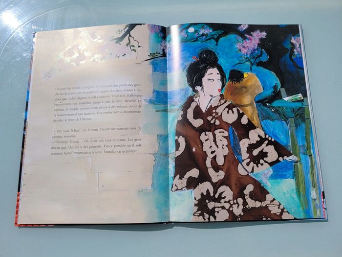 YOZAKURA, LA FILLE DU CERISIER Un conte japonais réinventé et illustré par Muriel Diallo Fille d'un vénérable cerisier et de la nuit, Yozakura est différente. Mais la différence inquiète, elle suscite les jalousies et attise la méchanceté. Comment une petite fille peut-elle y faire face ? C'est la peur de l'autre et de ses particularités qui est questionnée avec délicatesse au fil de magnifiques illustrations. Dans le chatoiement des couleurs, la sensibilité des images mêlant tissus, collages, dessins et assemblage de différents matériaux nous entraîne dans le récit vivant et initiatique de l'acceptation de l'altérité. Dimensions ‎24.5 x 0.2 x 33.5 cm TRÈS BON ÉTAT Mes autres livres enfants : #livreenfantmooglou