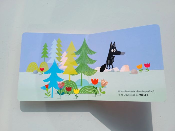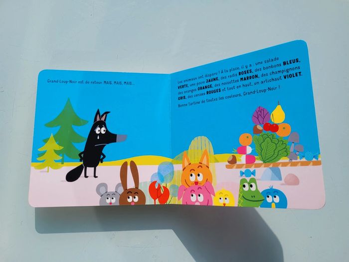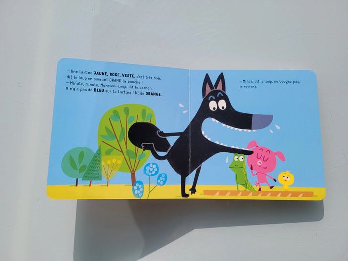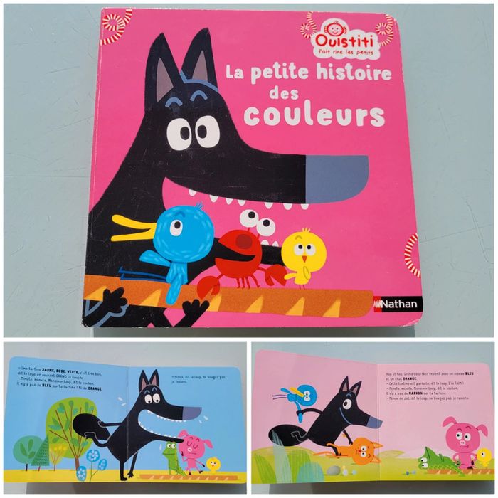 OUISTITI FAIT RIRE LES PETITS LA PETITE HISTOIRE DES COULEURS TOUT CARTON Une histoire pleine de fantaisie pour apprendre les couleurs en créant une tartine d'animaux colorés ! L'humour adapté aux bébés pour apprendre une notion clé : les couleurs. Un moment de complicité et de jeu avec son enfant. L'histoire : Grand loup noir attrape un cochon rose, une grenouille verte, un écureuil orange... à chaque fois qu'il s'apprête à croquer dans sa tartine, on lui fait remarquer qu'il manque une couleur. A la fin, alors que le loup cherche un animal violet, les animaux en profitent pour filer et lui laissent en échange une tartine végétarienne : un bonbon rose, un haricot vert, une orange orange, etc. En très bon état Mes autres livres enfants : #livreenfantmooglou