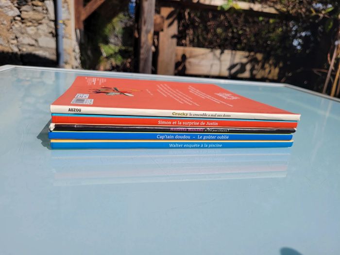 MES P'TITS ALBUMS - WALTER ENQUÊTE À LA PISCINE (71) - CAPT'AIN DOUDOU : le goûter oublié (71) - ROSETTA BANANA N'EST PAS CRACRA! (73) - SIMON ET LA SURPRISE DE JUSTIN (71) - CROCKY LE CROCODILE A MAL AUX DENTS Tous en très bon état (quelques petites pliures sur la couverture de Crocky et un coin très très légèrement abîmé sur Rosetta) Mes autres livres enfants : #livreenfantmooglou