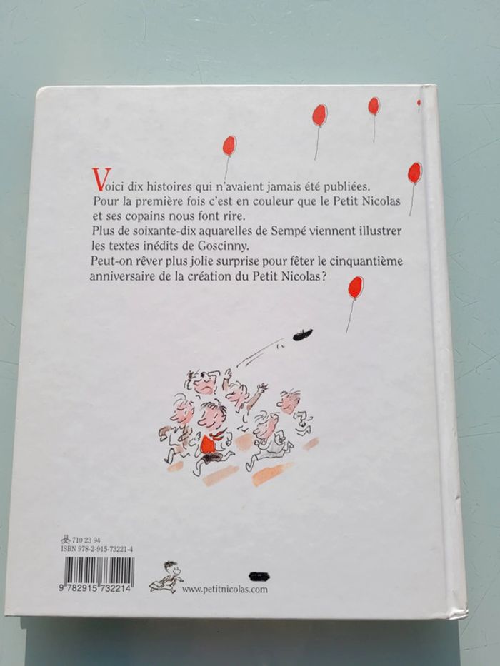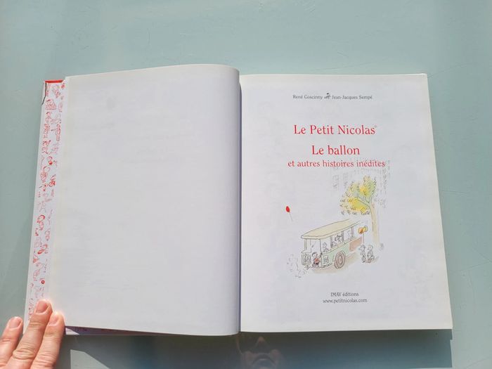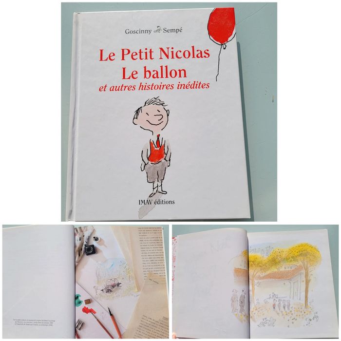LE PETIT NICOLAS LE BALLON ET AUTRES HISTOIRES INÉDITES Ce volume du Petit Nicolas débute par la toute première histoire du Petit Nicolas, L’œuf de Pâques publiée le 29 mars 1959 dans Sud-Ouest-Dimanche. Cette histoire constitue l’acte de naissance du Petit Nicolas.  Goscinny et Sempé campent un Petit Nicolas tel qu’il deviendra célèbre. Papa et Maman se disputent gentiment et quelques copains entrent en scènes comme Alceste et un éphémère Joseph. Le voisin Blédurt est déjà là pour donner la réplique à Papa.  En très bon état, une inscription personnelle sur la première page Mes autres livres enfants : #livreenfantmooglou