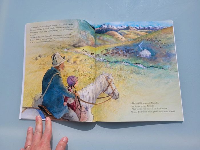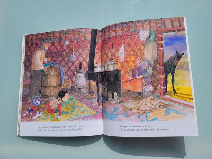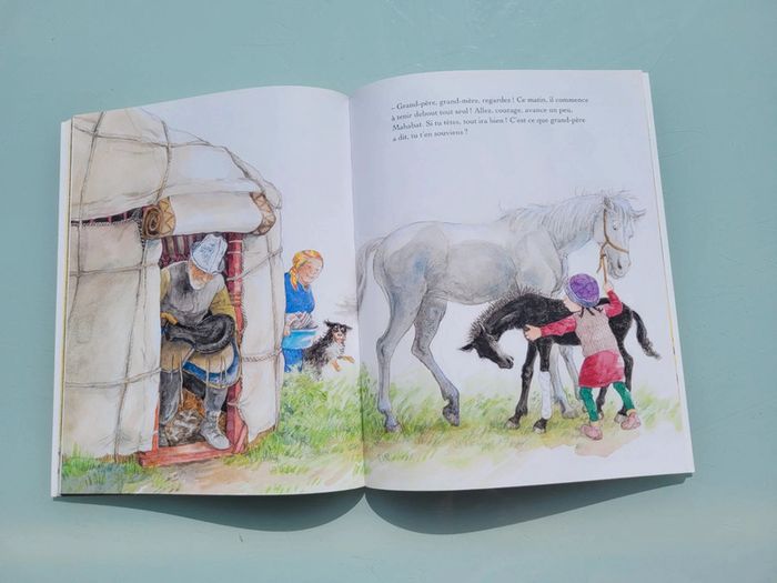 L'ÉCOLE DES LOISIRS COUVERTURE SOUPLE MON PETIT CHEVAL MAHABAT Pour la première fois, Djamilia vient passer ses vacances dans les montagnes du Kirghizistan, chez ses grands-parents éleveurs de chevaux, qui dorment dans une belle yourte blanche. mais où est Petit-Noir le poulain ? Parti tout seul à l'aventure, il s'est blessé à la patte. Il faut l'aider à téter sa maman, le rassurer, lui parler doucement, le panser... Djamilia est prête à apprendre tout cela, pour l'amour de Petit-Noir !  21.5x26.5 cm Très bon état Mes autres livres enfants : #livreenfantmooglou Mes autres école des loisirs : #lecoledesloisirsmooglou