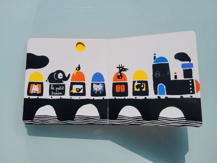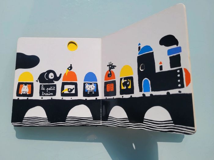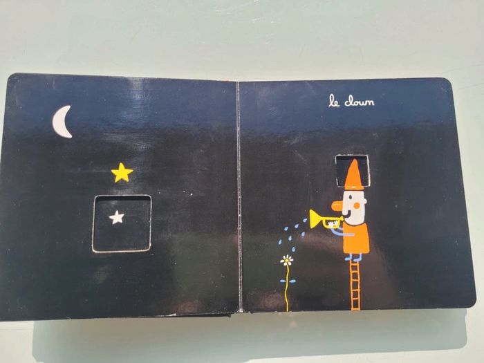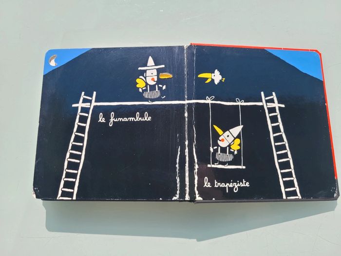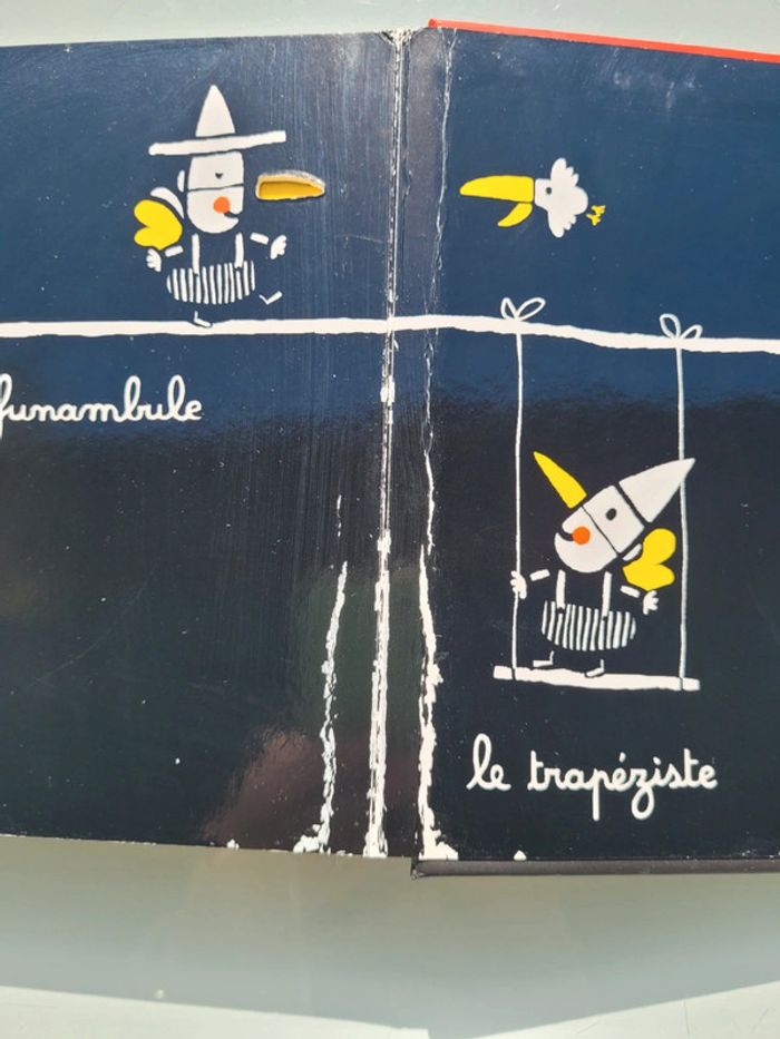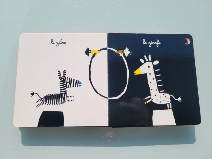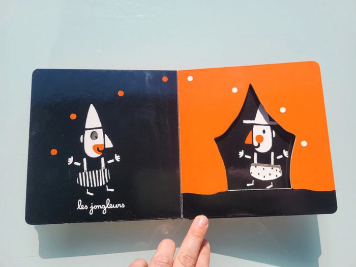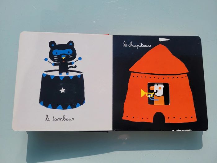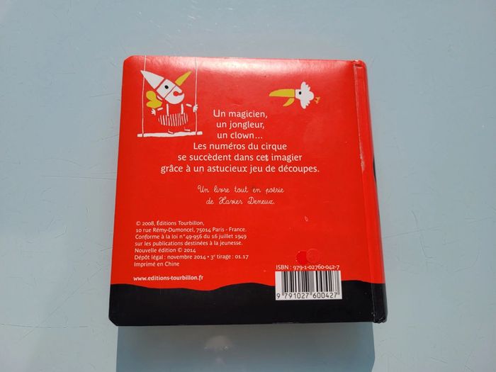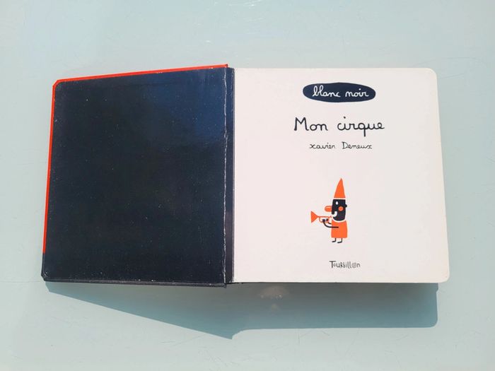 MON CIRQUE ÉDITIONS TOURBILLON UN LIVRE AVEC DES DÉCOUPES Mon cirque, un premier imagier tout en poésie de Xavier Deneux. Un magicien, un jongleur, un clown… les numéros du cirque se succèdent grâce à un astucieux jeu de découpes. Un bel imagier cartonné avec un un jeu de noir et blanc et quelques touches de couleurs contrastées pour éveiller la curiosité et les sens. Livre tout carton couverture mousse, abîmé en dernière page (cf photo) sinon en très bon état Mes autres imagiers : #imagiermooglou Mes autres livres enfants : #livreenfantmooglou
