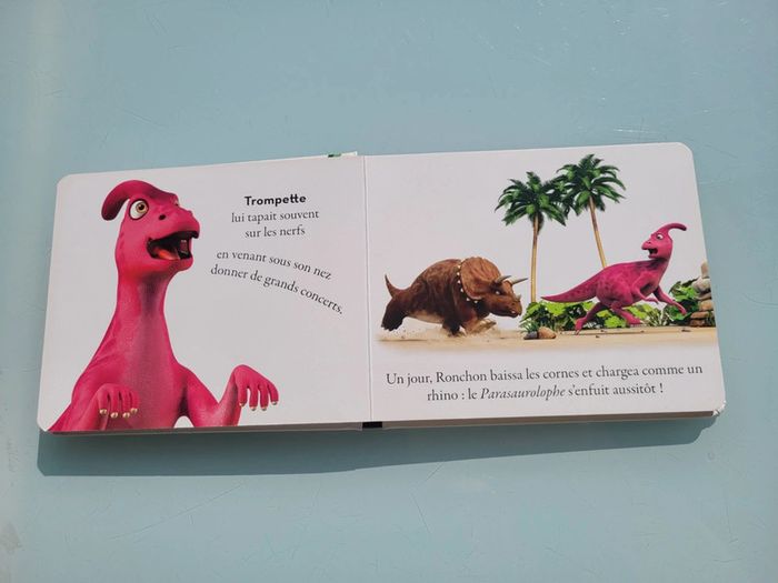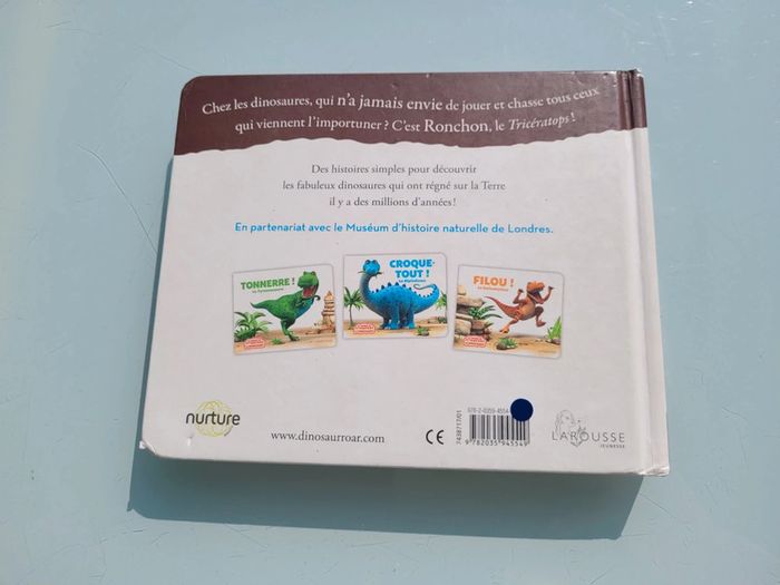 RONCHON! LE TRICERATOPS Les dinosaures fascinent les enfants dès leur plus jeune âge. Ils leur font peur, les intriguent, les impressionnent et suscitent de nombreuses questions… Avec Ronchon, le tricératops grognon, et sa bande de dinos, les tout-petits vont enfin pouvoir pénétrer ce monde qui les fascine ! Une histoire ludiqueUne double documentaire pour tout savoir sur le tricératopsDes illustrations en 3D qui respectent les caractéristiques propres et les proportions de chaque dinosauresDes personnages attachants au caractère bien trempé : Ronchon, le tricératops, est le solitaire de la bande. Résumé : Ronchon n’a jamais envie de jouer et chasse vite fait tous ceux qui viennent l’importuner. Mais grâce à une mésaventure, il comprendra que parfois dans la vie, on a besoin d’un ami. Dimensions ‎18.8 x 2 x 15.4 cm En très bon état, juste 2 petits poinçon sur le haut de la couverture (cf photo) Mes livres par thème : #livredinosauresmooglou Mes autres livres enfants : #livreenfantmooglou